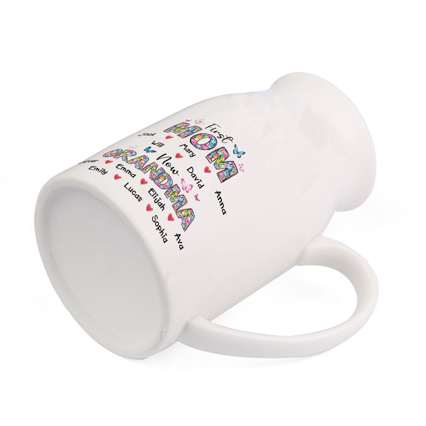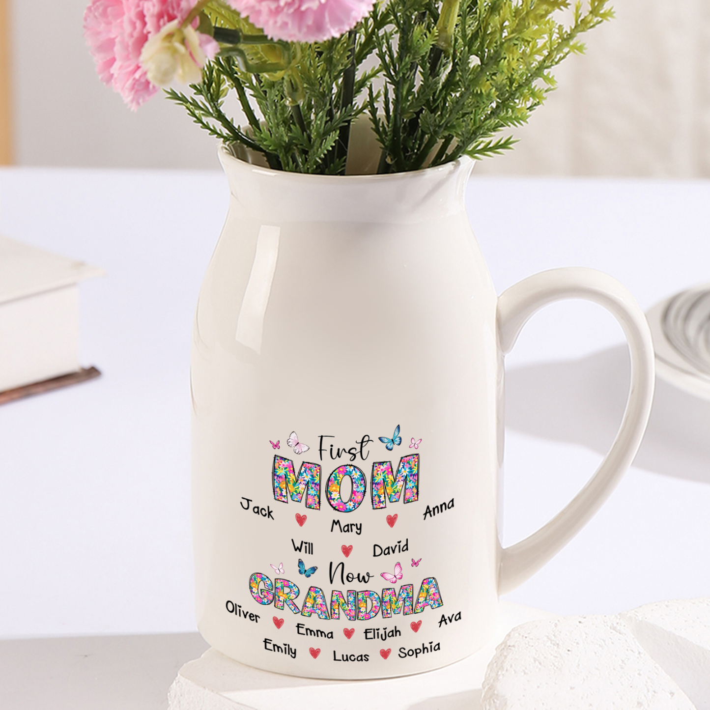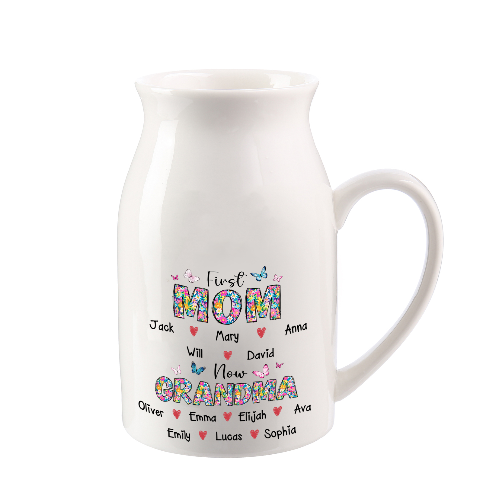 Give a heartwarming and practical gift with this personalized ceramic pitcher vase, thoughtfully designed for grandmas, moms, or any special woman in your life. Customizable with up to 12 names and the sweet “First Mom, Now Grandma” design, this classic white jug is both a functional home accent and a treasured keepsake.