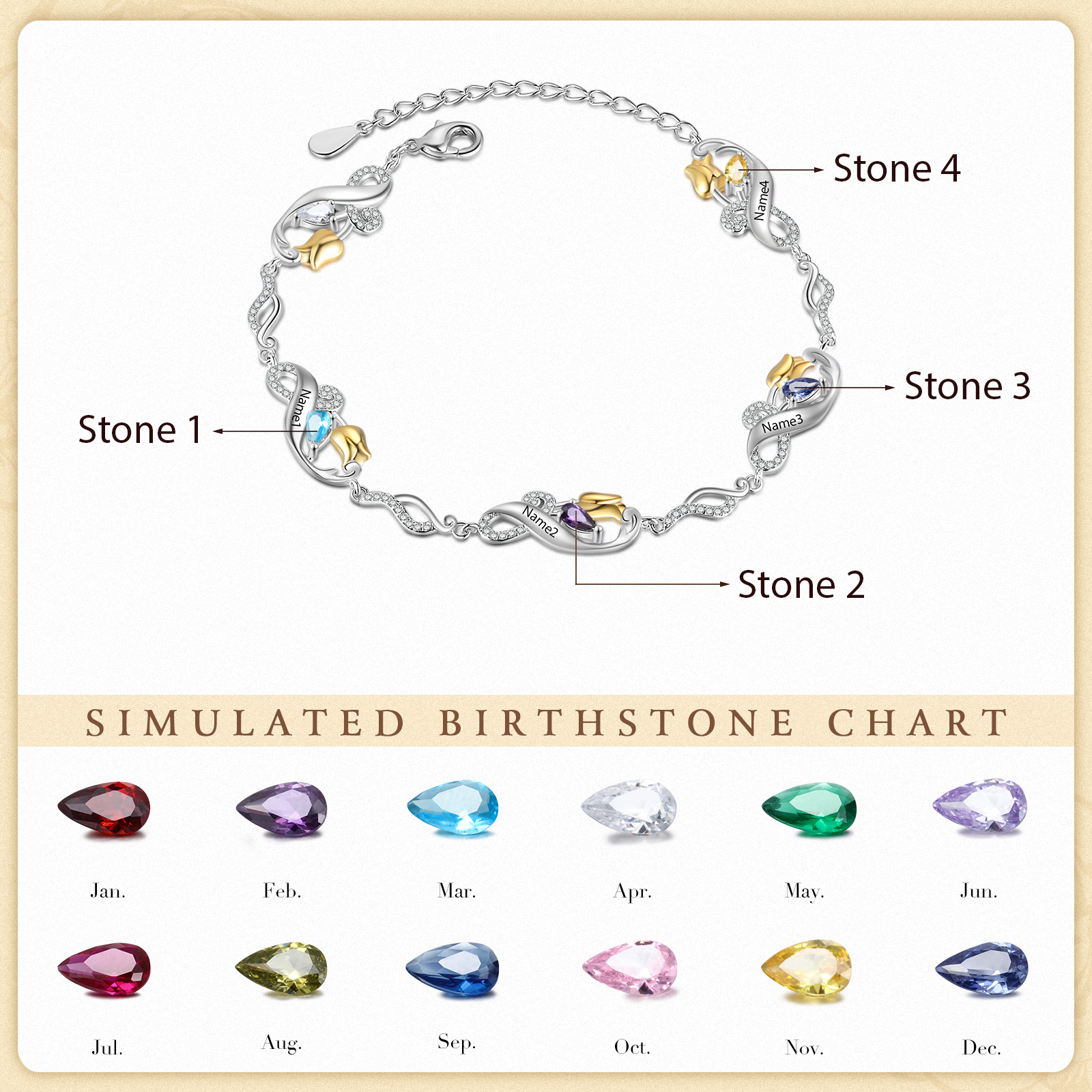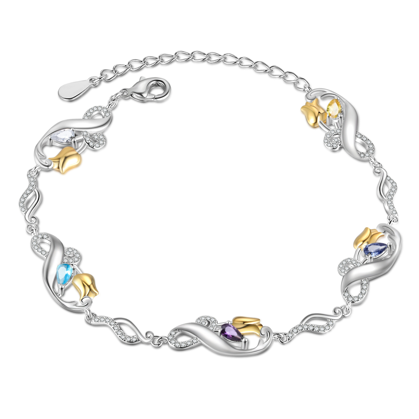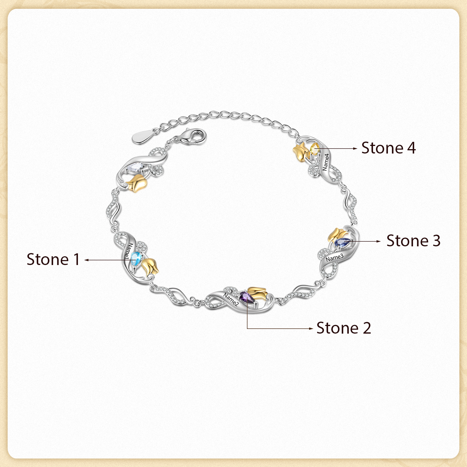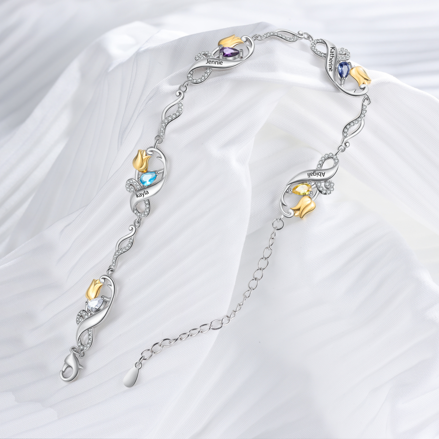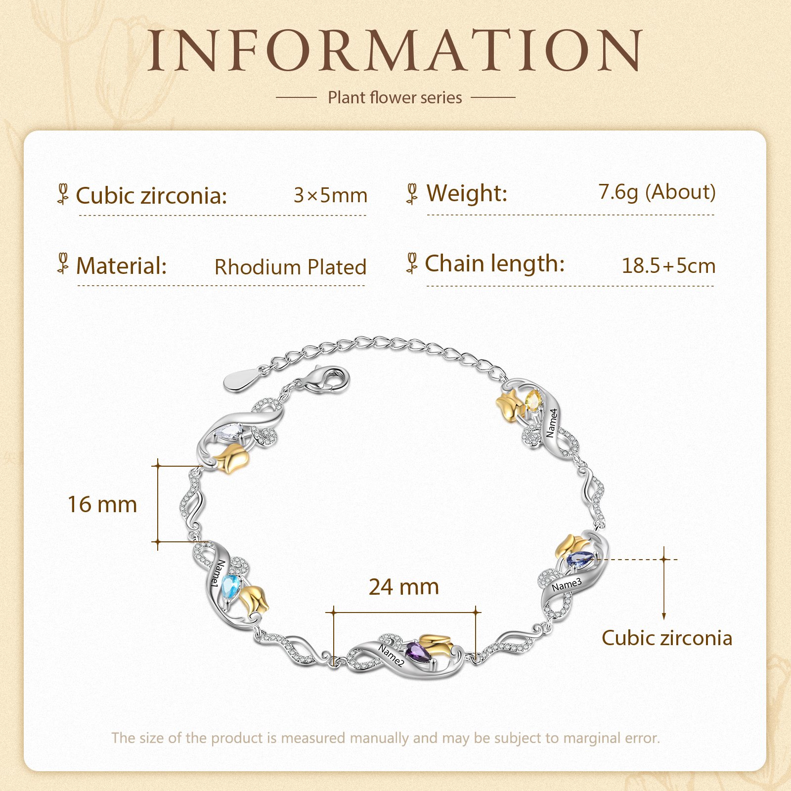 Flowers Series Personalized Tulip Bracelet With 4 Birthstone Engraved Names Flowers Charm Gifts For Her