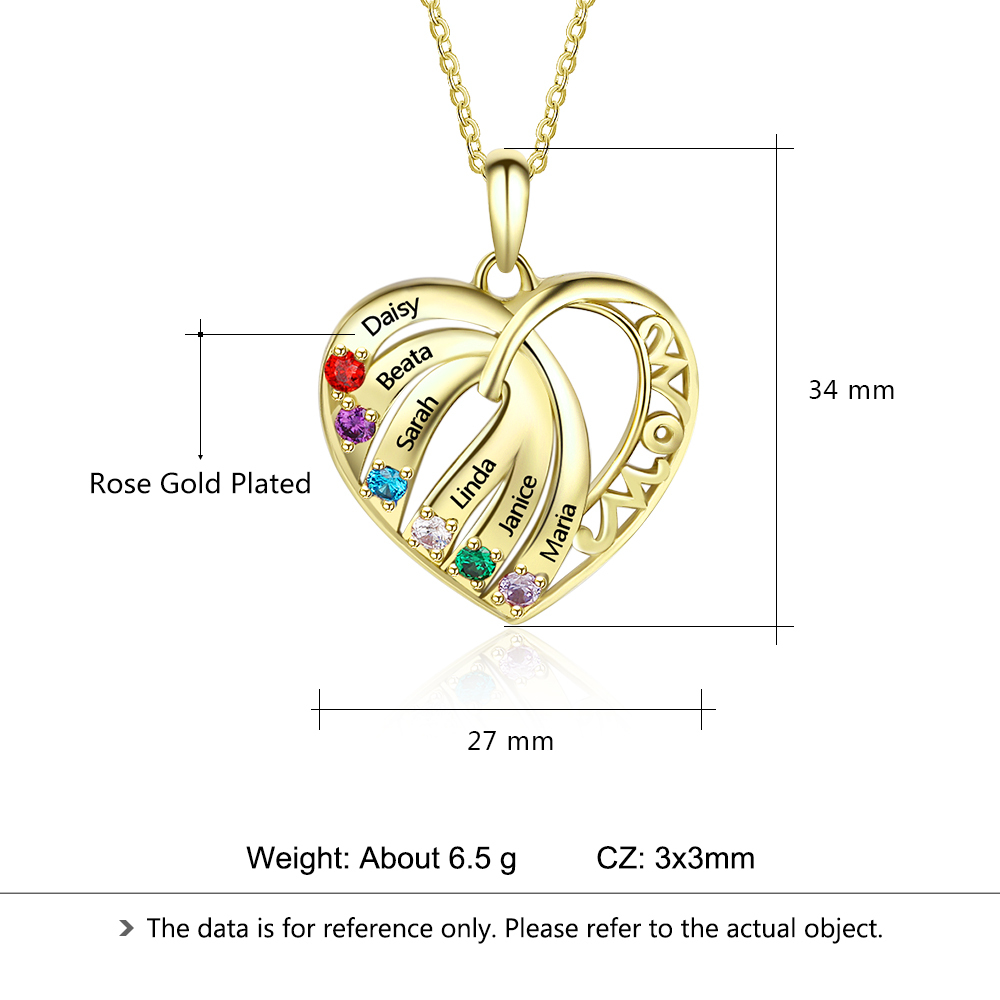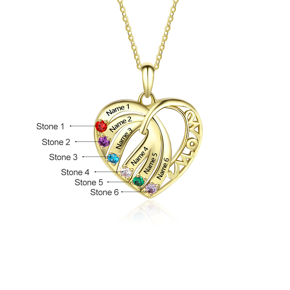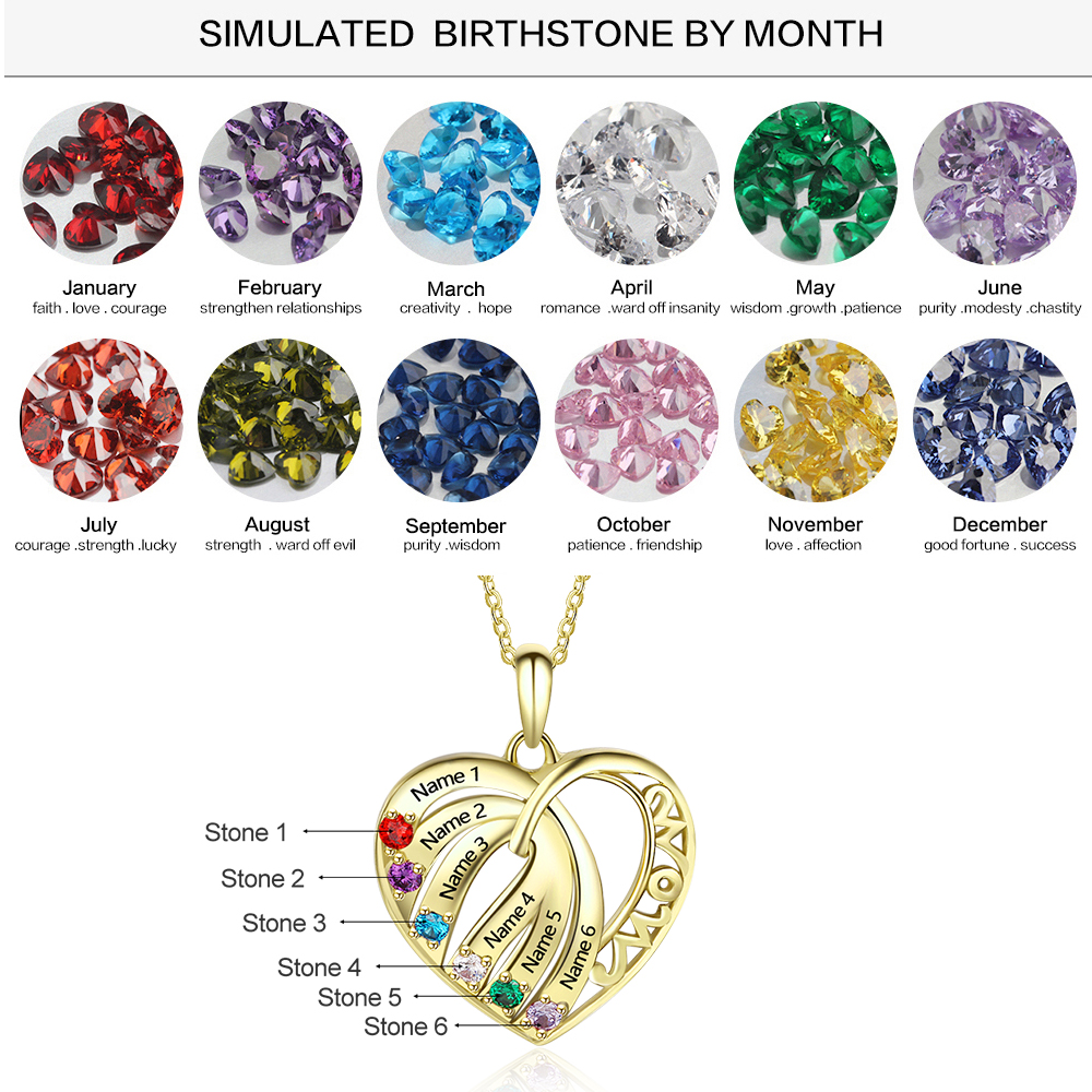 Personalized Heart Necklace With 6 Birthstones Engraved Names Gift For Her