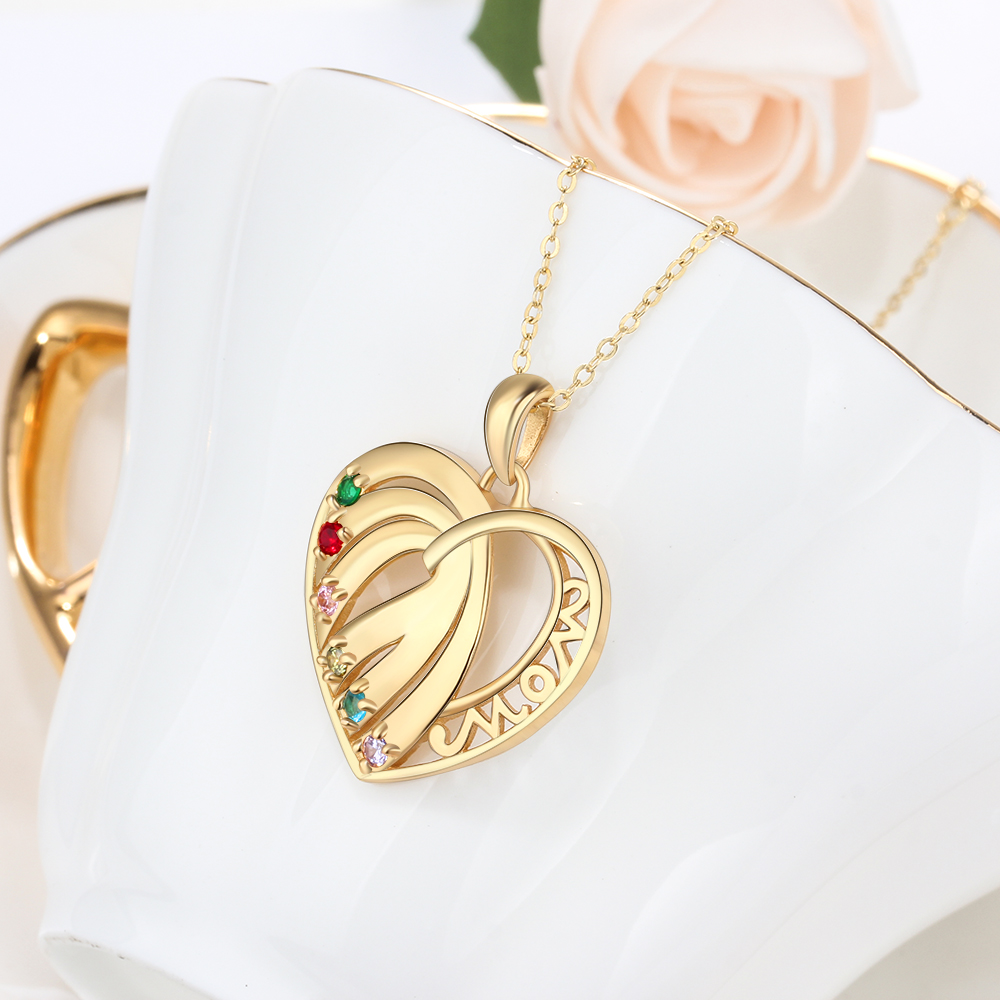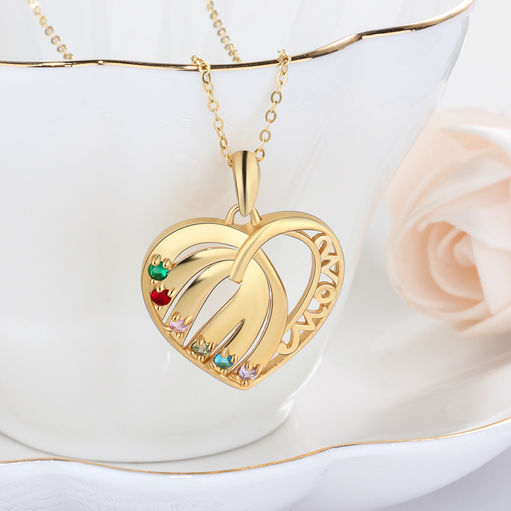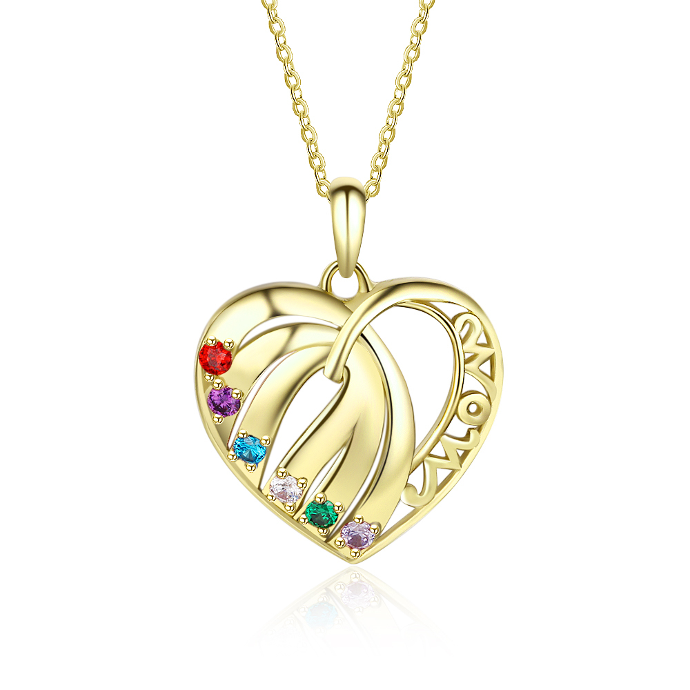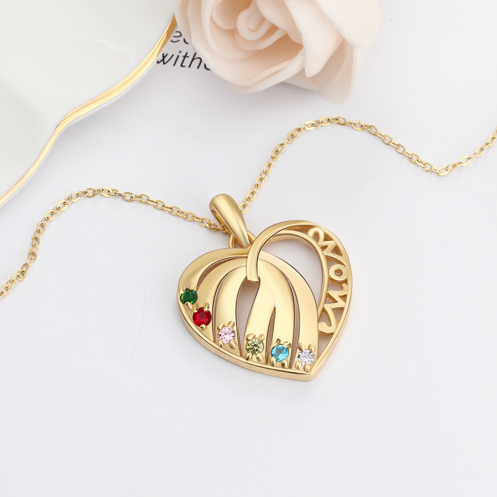 Personalized Heart Necklace With 6 Birthstones Engraved Names Gift For Her