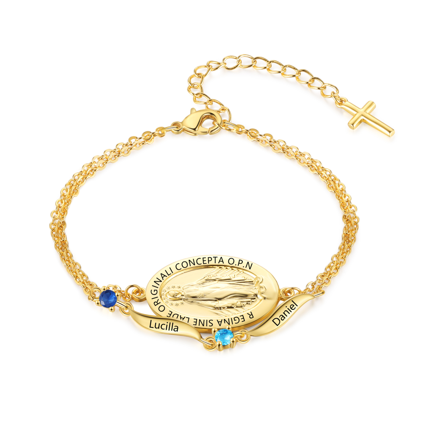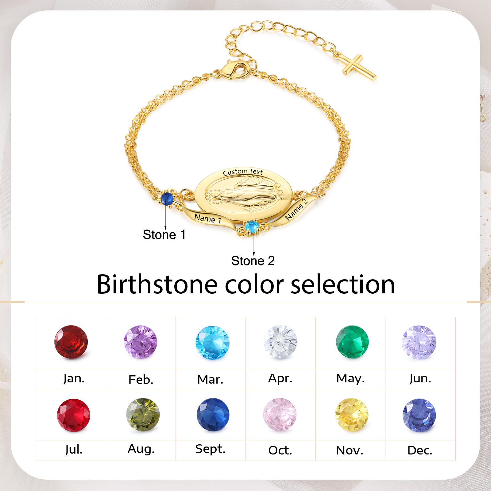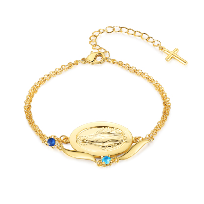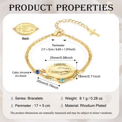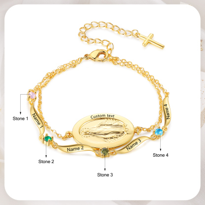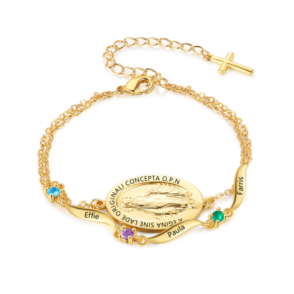 Give a heartwarming and practical gift with this personalized Virgin Mary birthstone bracelet—thoughtfully made for moms, grandmas, wives, daughters, godmothers, or any cherished woman of faith. Add up to 2 names, 1–2 birthstones, and optional custom text on the medal to create a daily reminder of love, protection, and connection.