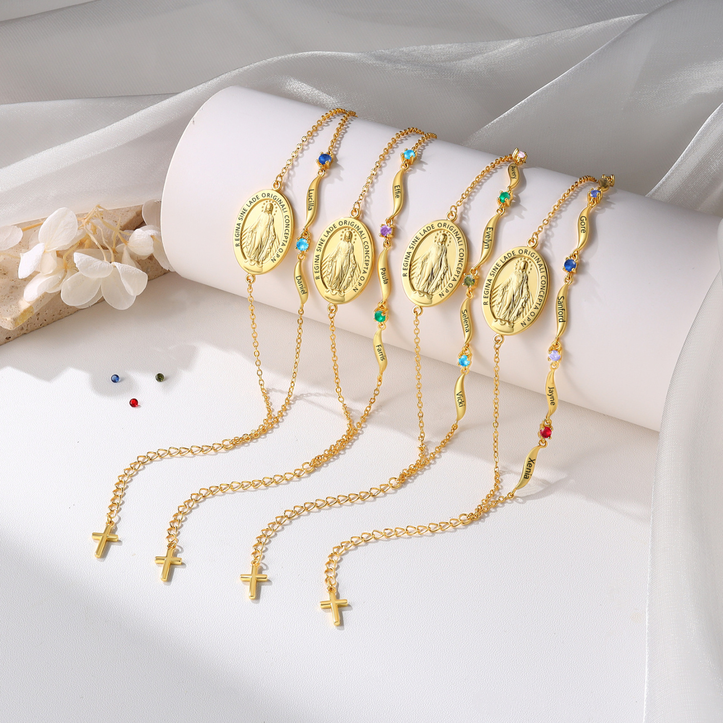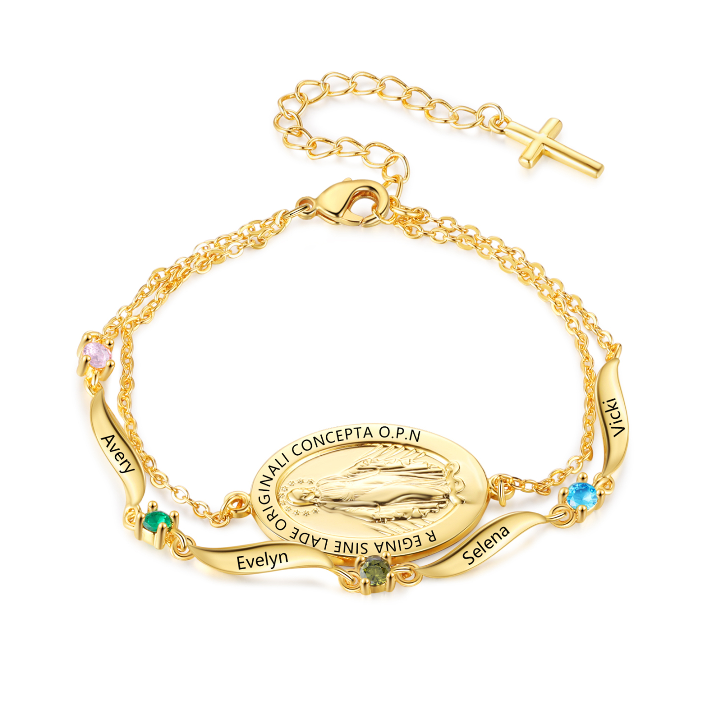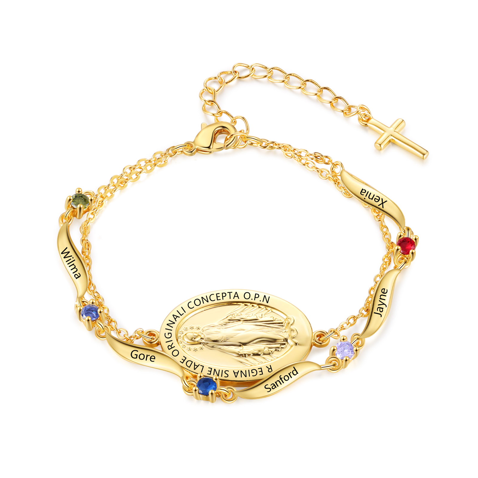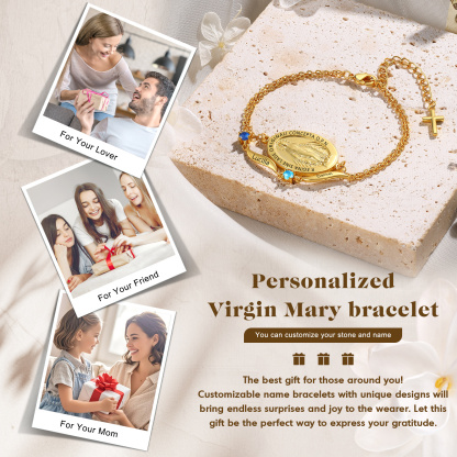 Keywords: personalized Virgin Mary bracelet, custom name bracelet, birthstone bracelet, Catholic gift for women, religious jewelry, faith bracelet, gift for mom, godmother gift, meaningful keepsake
