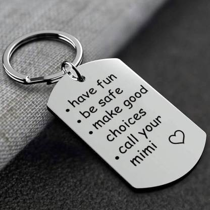 This gorgeous keychain comes engraved with, "have fun, be safe, make good choices, call your grandma/grandpa/dad/mom".