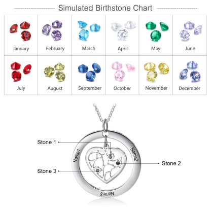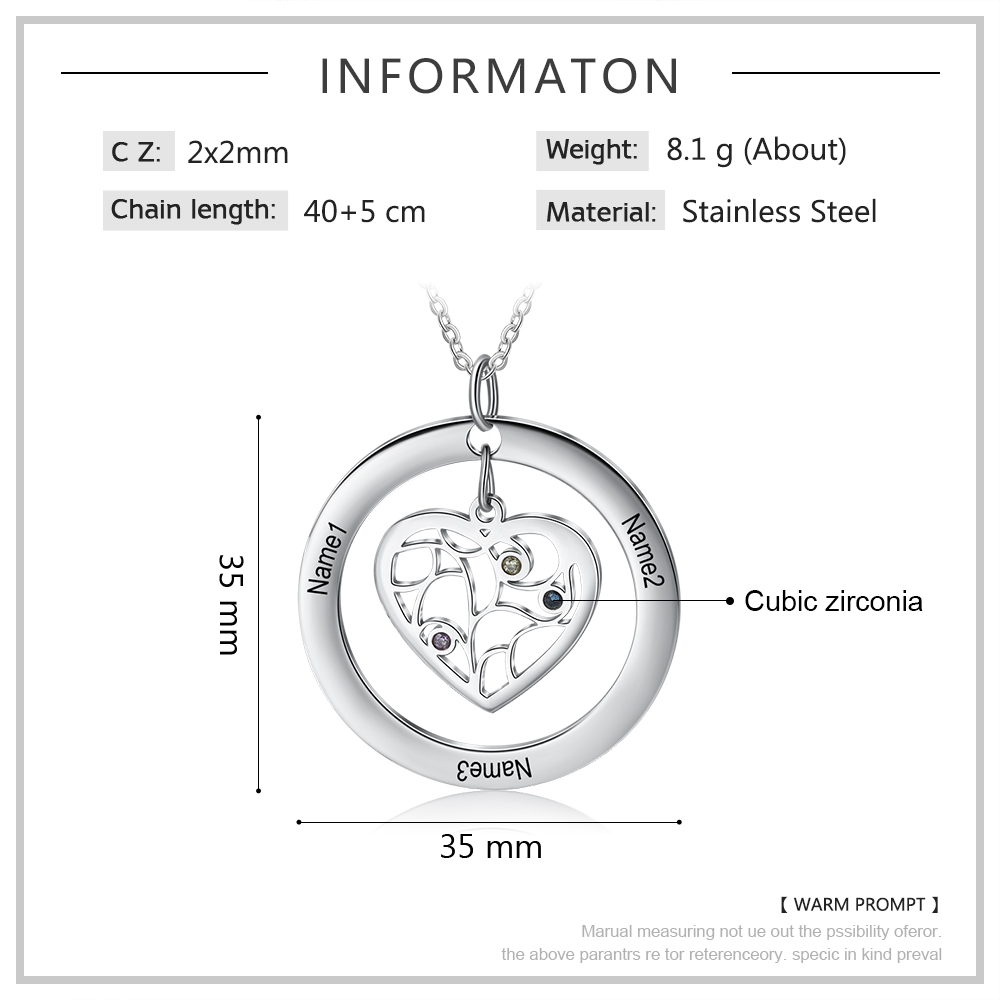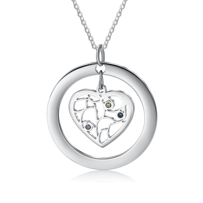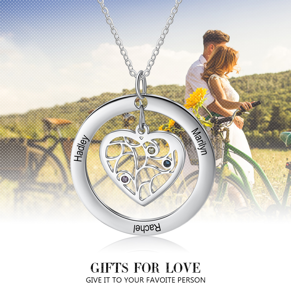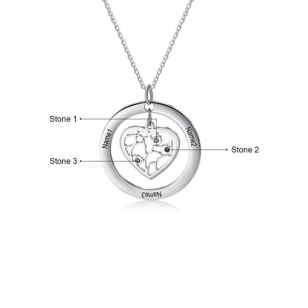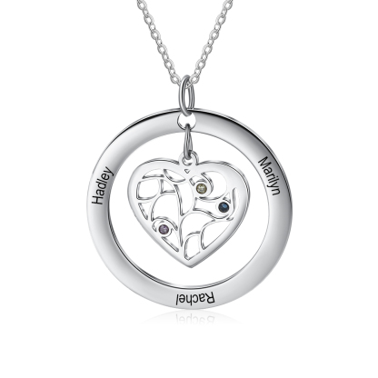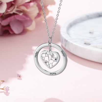 Customized Family Tree Necklace with Birthstones Engraved 3 Names Circle Heart Necklace for Women