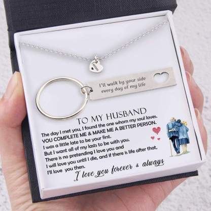 I'll Walk By Your Side Every Day Of My Life, Heart Necklace & Keychain Gift Set Gifts For Husband