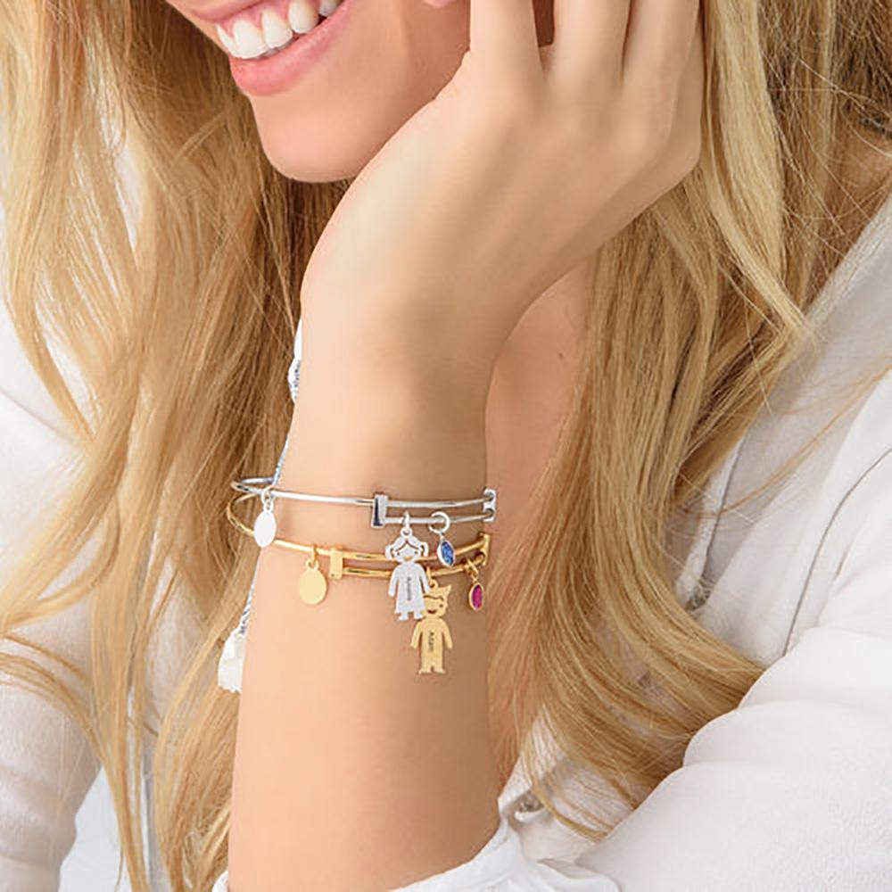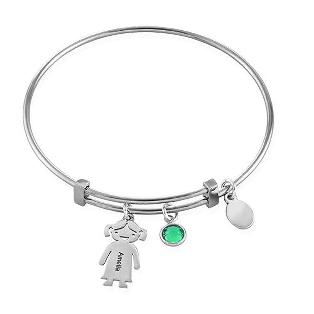 Our Bangle Bracelet with Kids Charms shows mom you love her to the moon and back! This enchanting piece is beautifully customized with up to four child charms. Choose boys and/or girls, and we’ll customize each one with the inscription of your choice. Add up to four genuine Swarovski crystal birthstones to make this beautiful bangle complete.