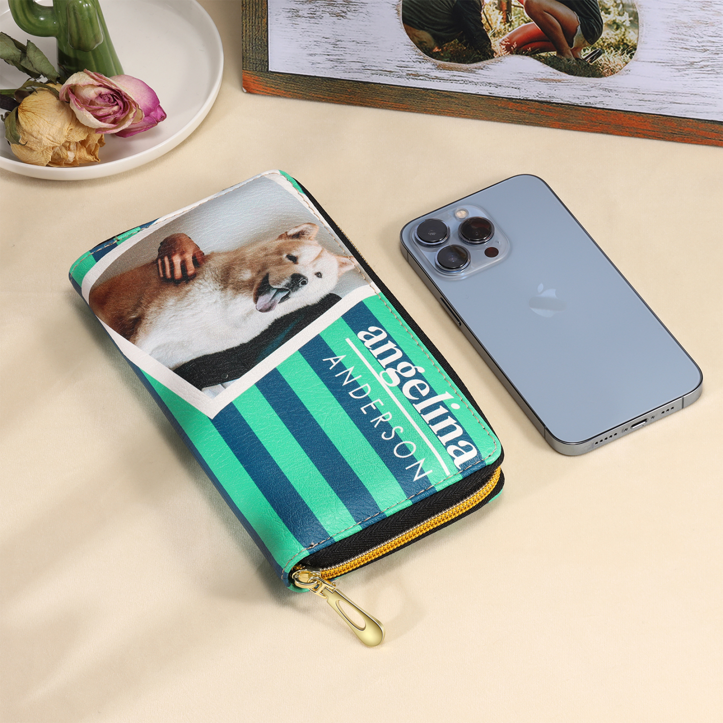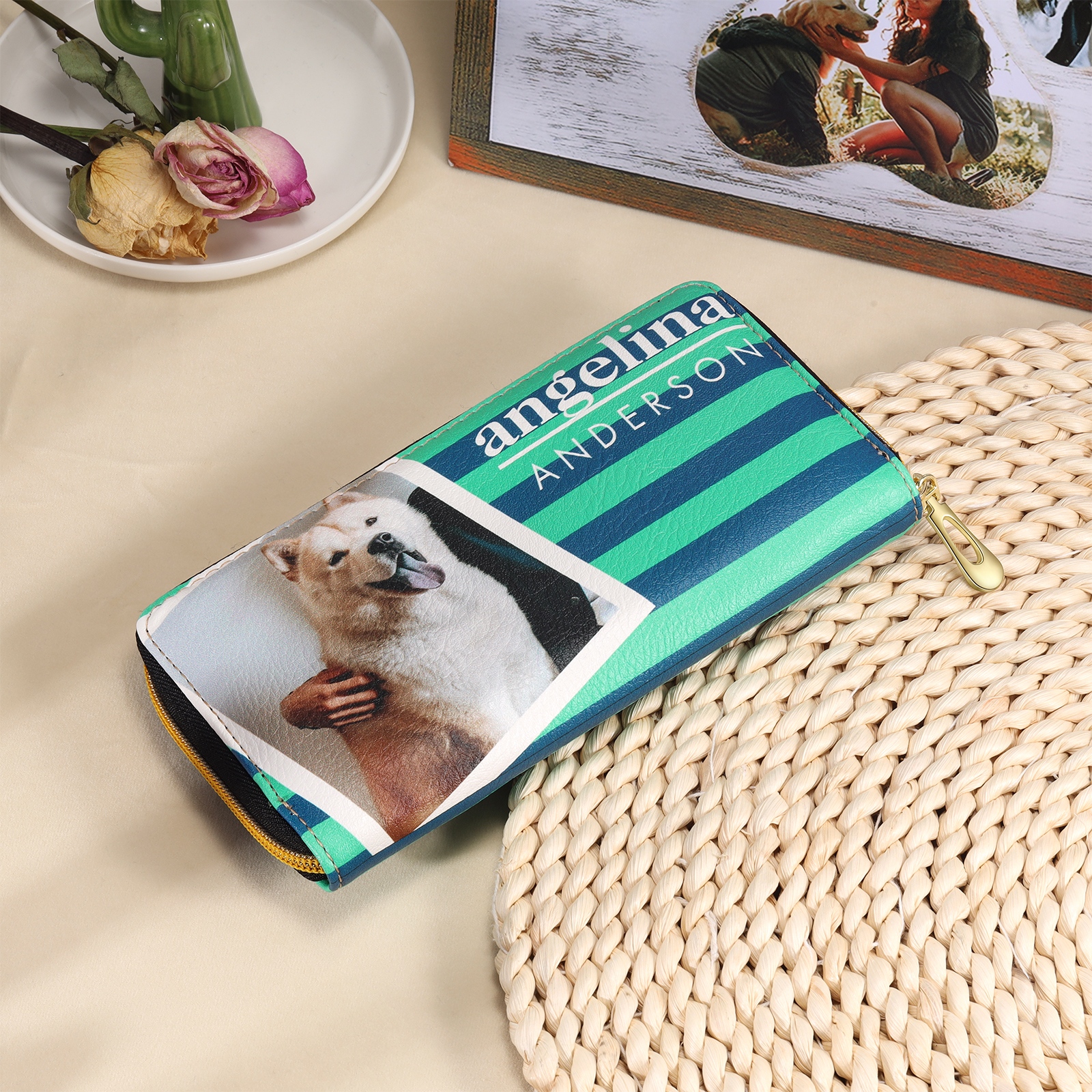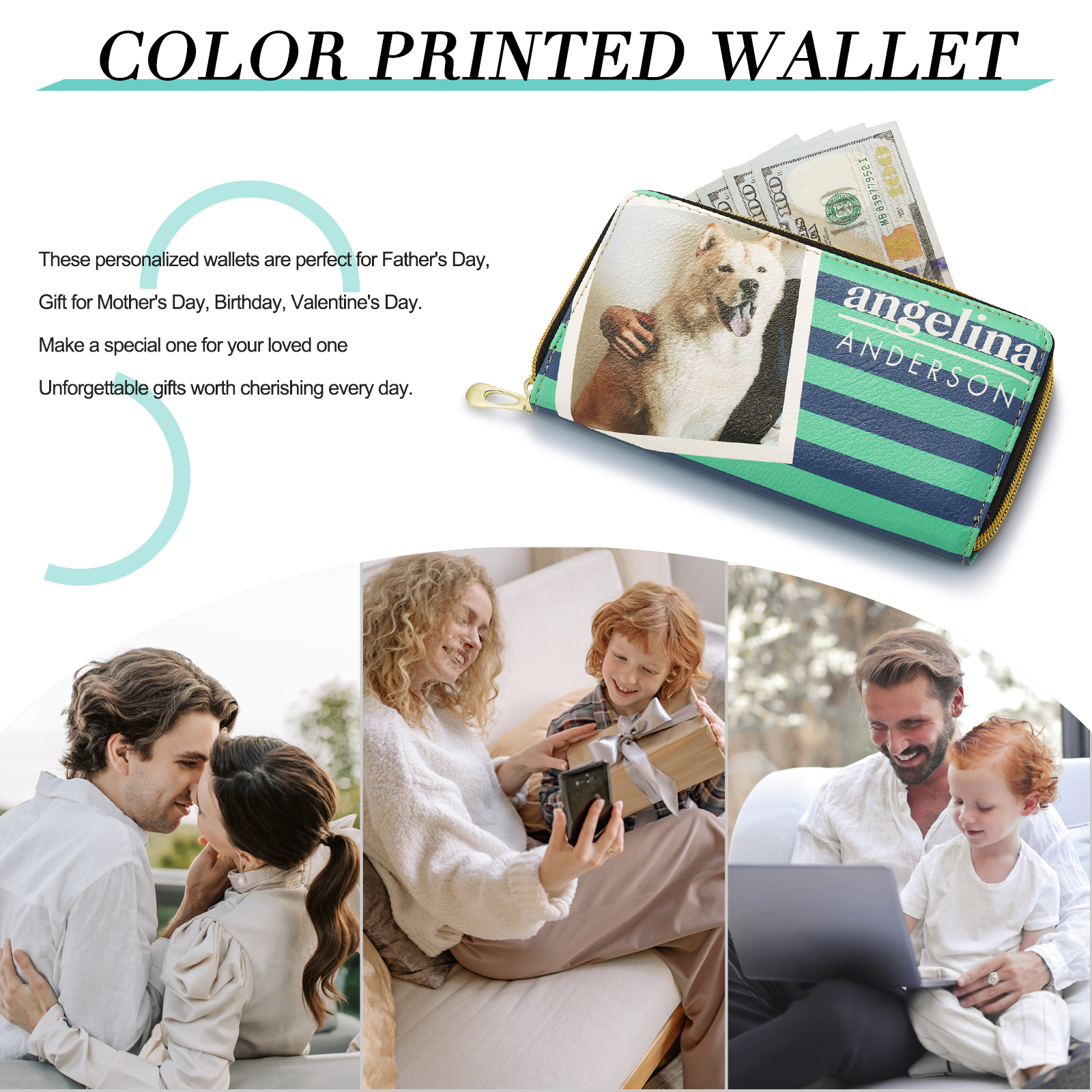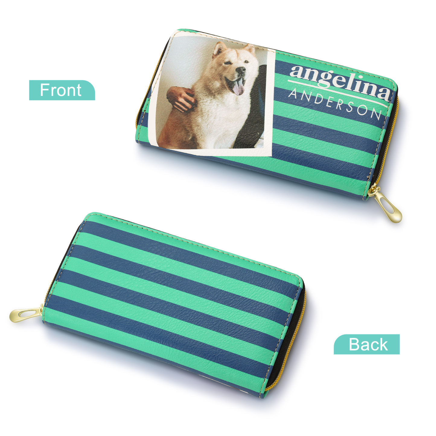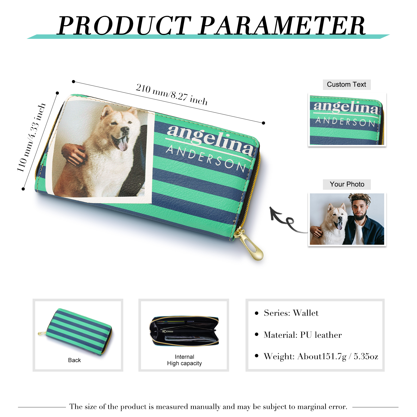Long Purse Personalized Stripe Leather Wallet Engraved 1 Photo Zip Wallet Gifts for Her