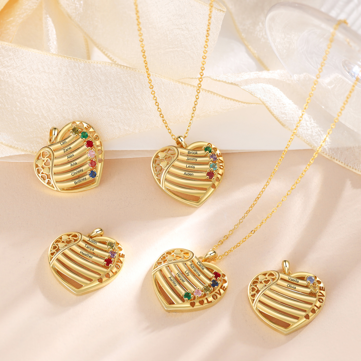 LOVE Heart Necklace Custom 5 Names & Birthstones Family Necklace Gifts For Her
