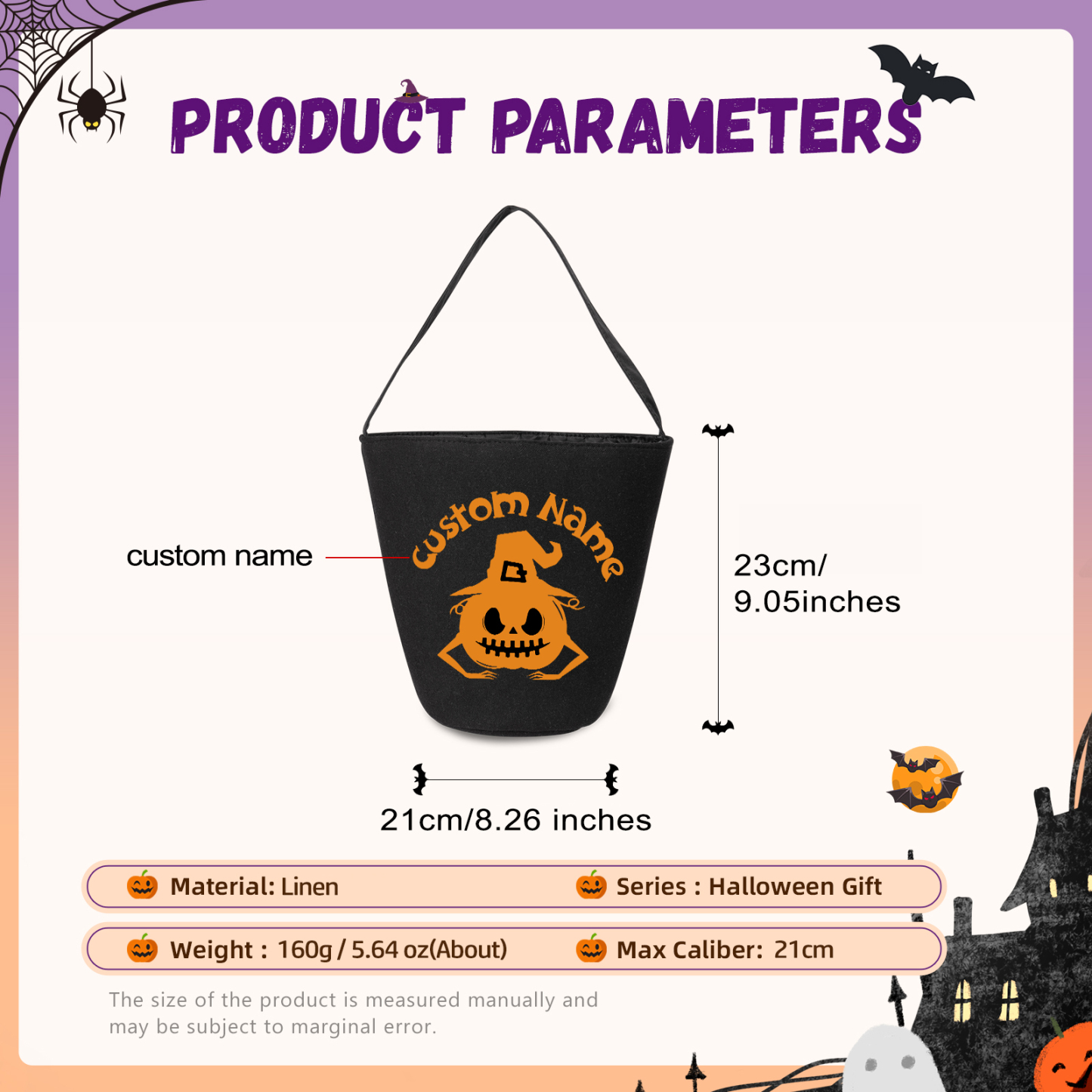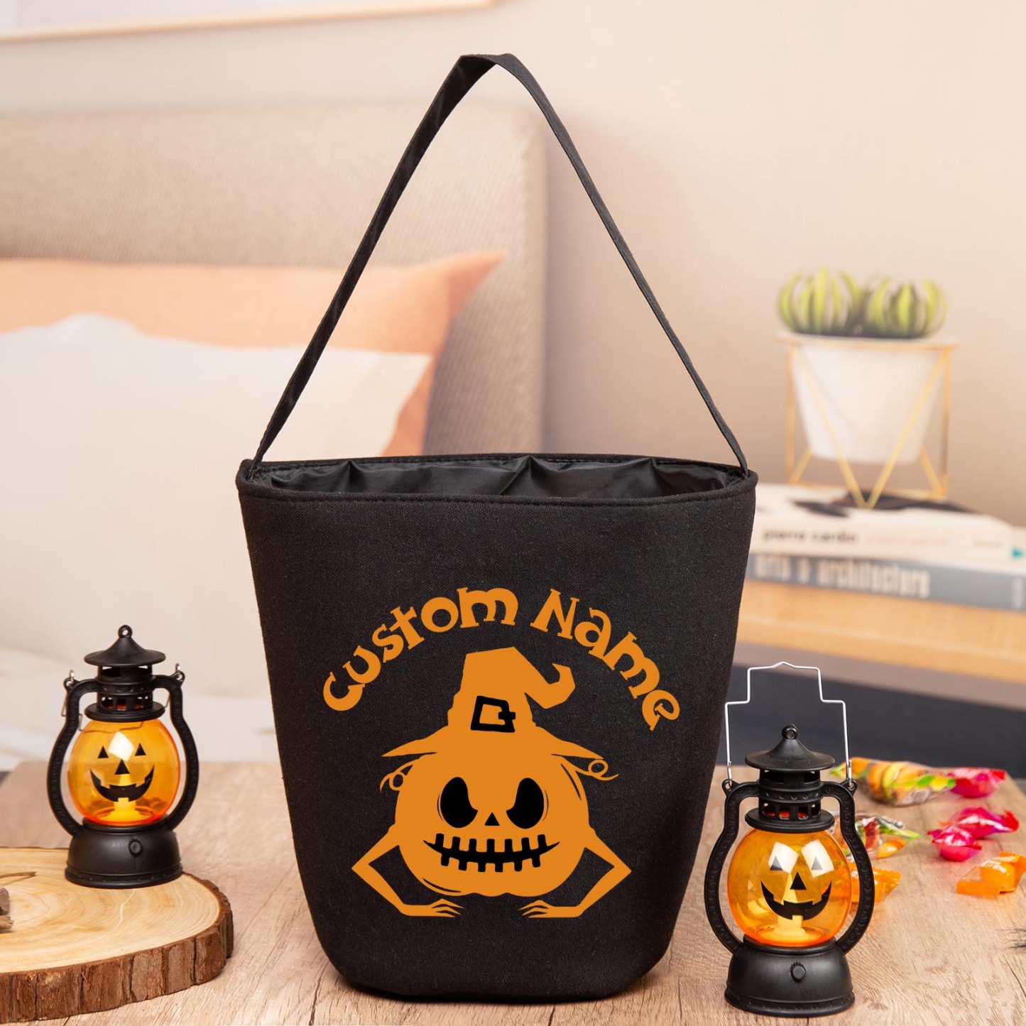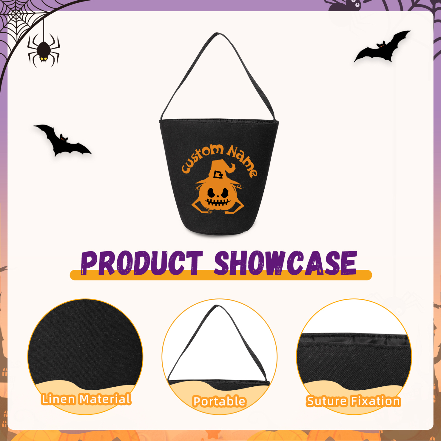 Personalized 1 Name Halloween Kids Tote Bag, Custom Bucket Bag Halloween Party Supplies Black Candy Bags for Kids