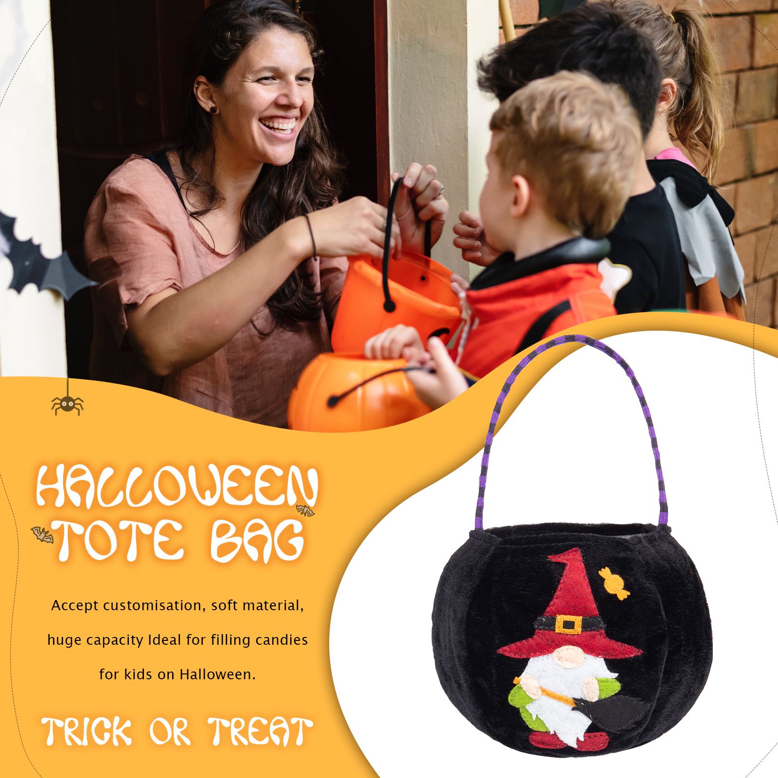 🎃Introducing our latest Halloween Candy Bag, now available with customizable names! This spooktacular candy bag is the perfect accessory for trick-or-treating and Halloween parties. Made from durable materials, it ensures your candies stay safe and secure throughout the night.