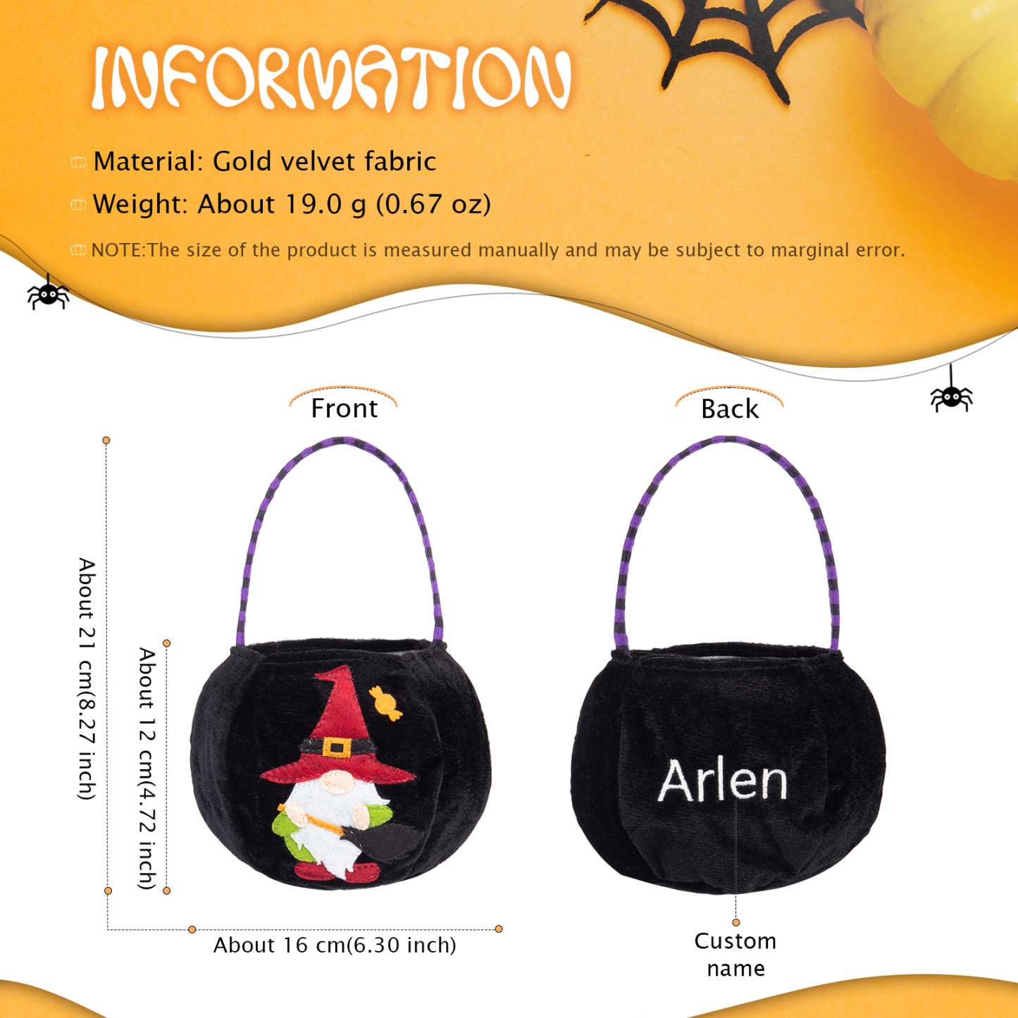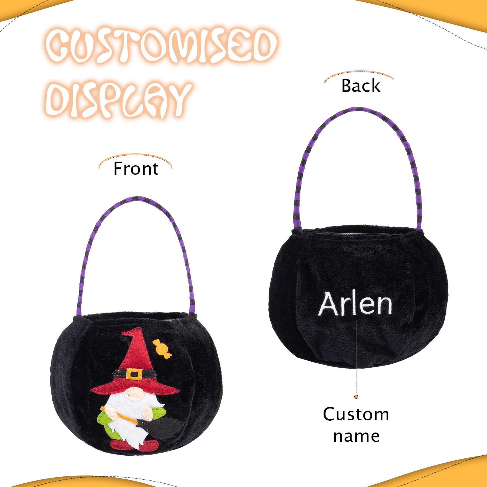 With our unique customization option, you can add your desired name to make this candy bag truly one-of-a-kind. Whether it's your own name, a spooky moniker, or a fun nickname, personalizing your candy bag adds an extra touch of Halloween magic.
