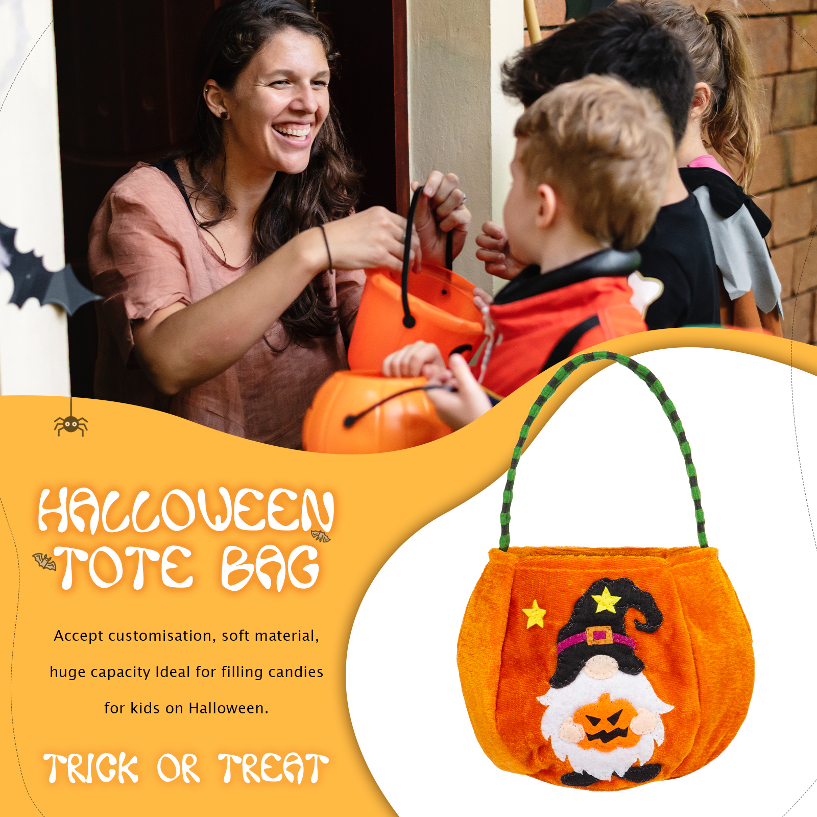 🎃Introducing our latest Halloween Candy Bag, now available with customizable names! This spooktacular candy bag is the perfect accessory for trick-or-treating and Halloween parties. Made from durable materials, it ensures your candies stay safe and secure throughout the night.