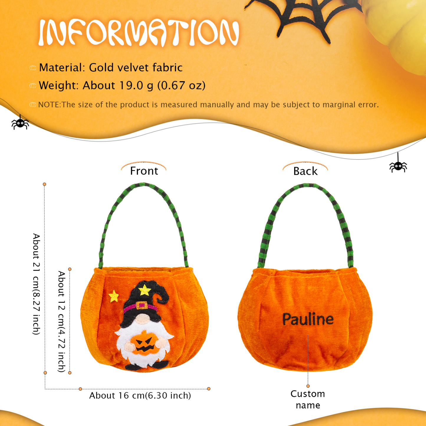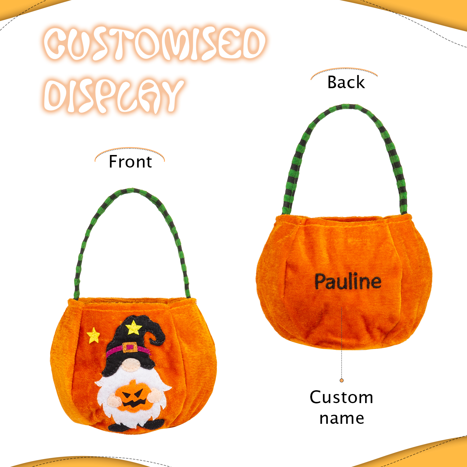 With our unique customization option, you can add your desired name to make this candy bag truly one-of-a-kind. Whether it's your own name, a spooky moniker, or a fun nickname, personalizing your candy bag adds an extra touch of Halloween magic.