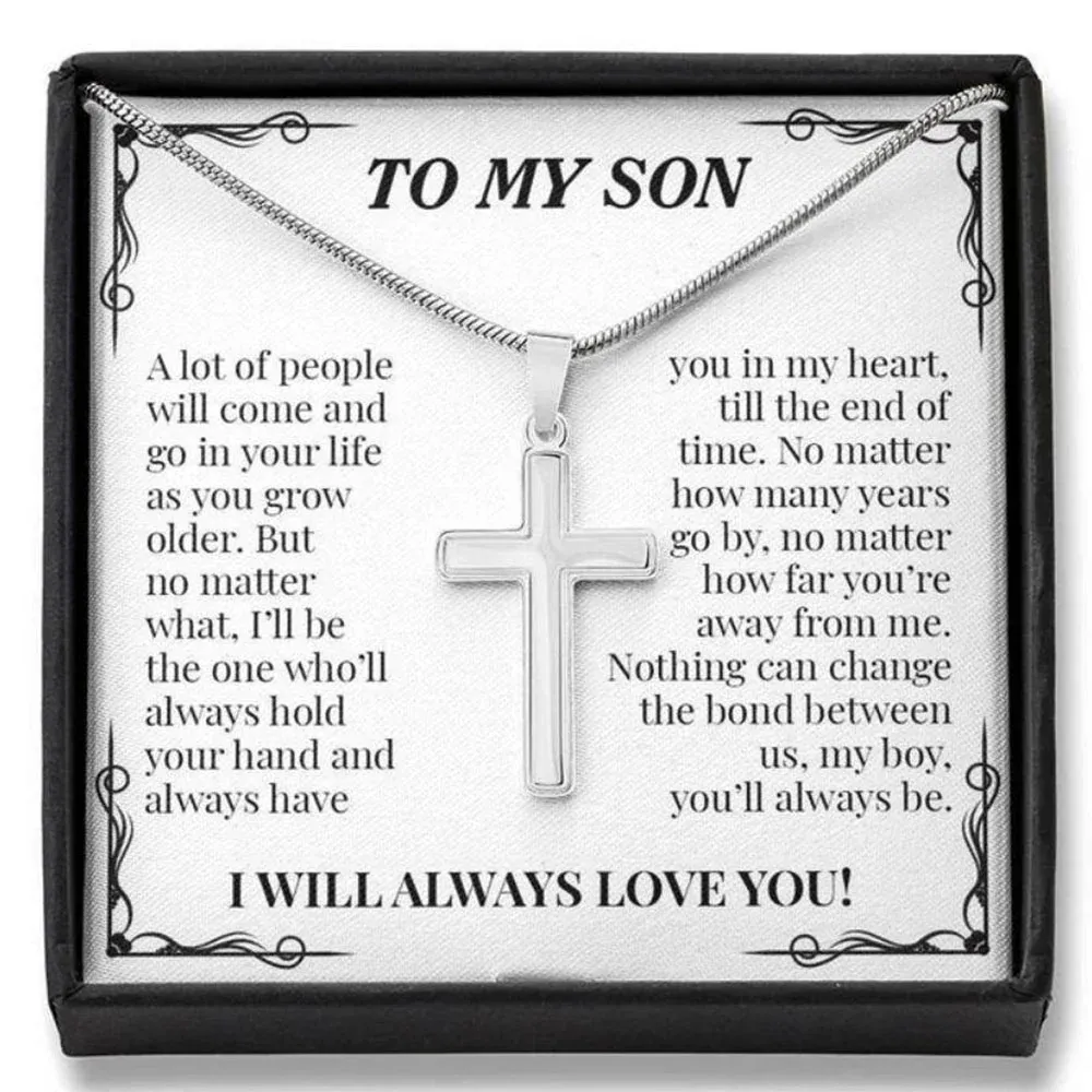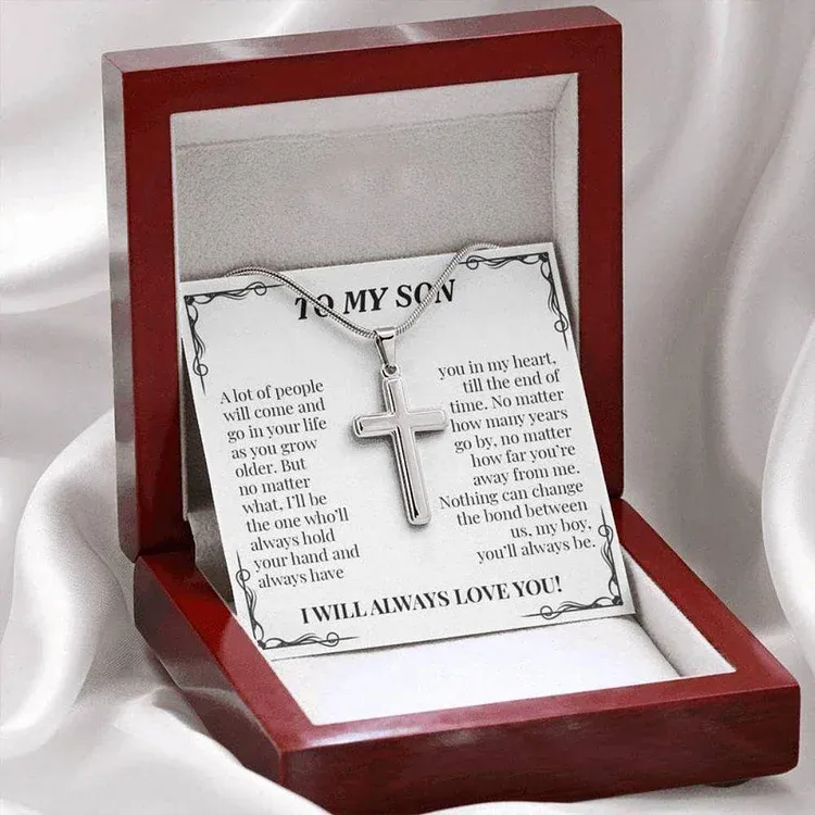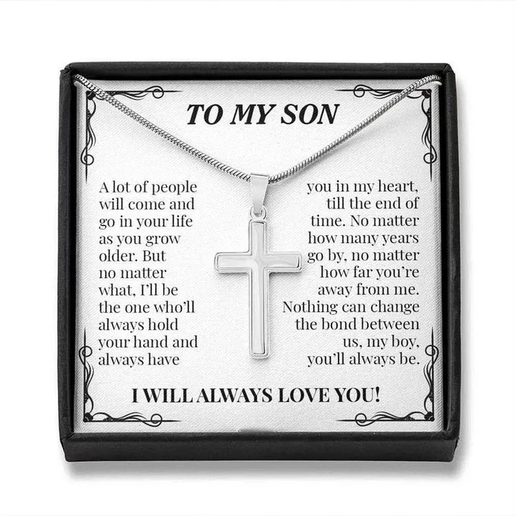 Personalized 1 Text To My Son S925 Silver Cross Necklace Set with Gift Card Gift Card-Custom Men Necklace Gift For Son-I Will Always Love You