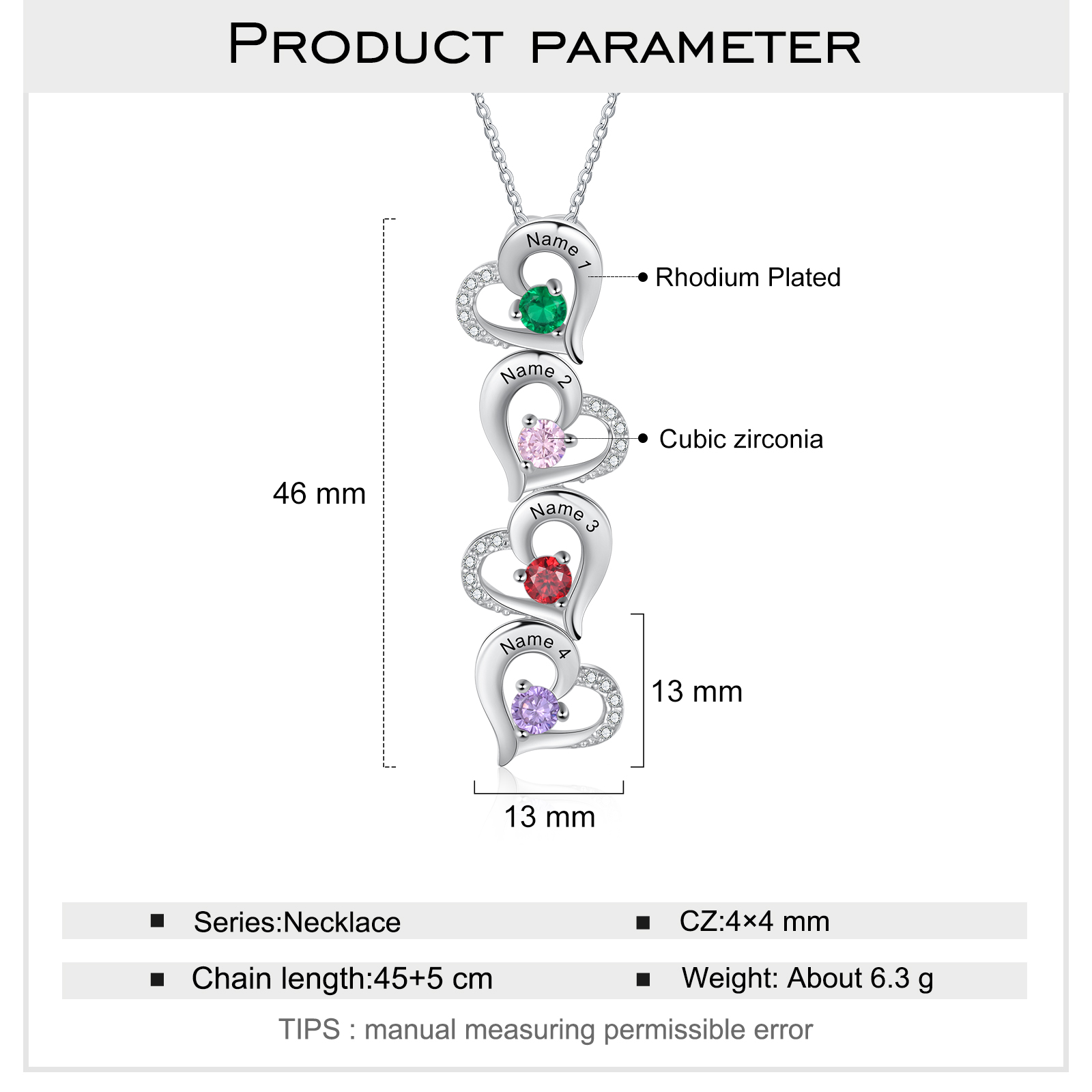 - Personalization : 4 Names/Dates/ID on the Heart pendant.