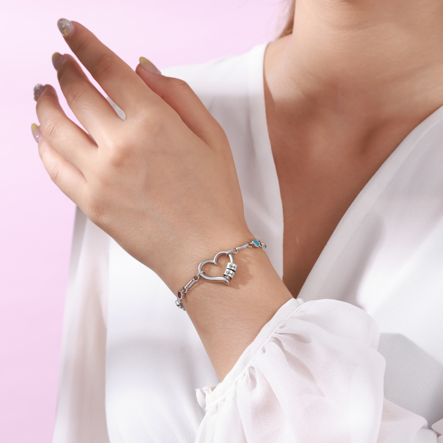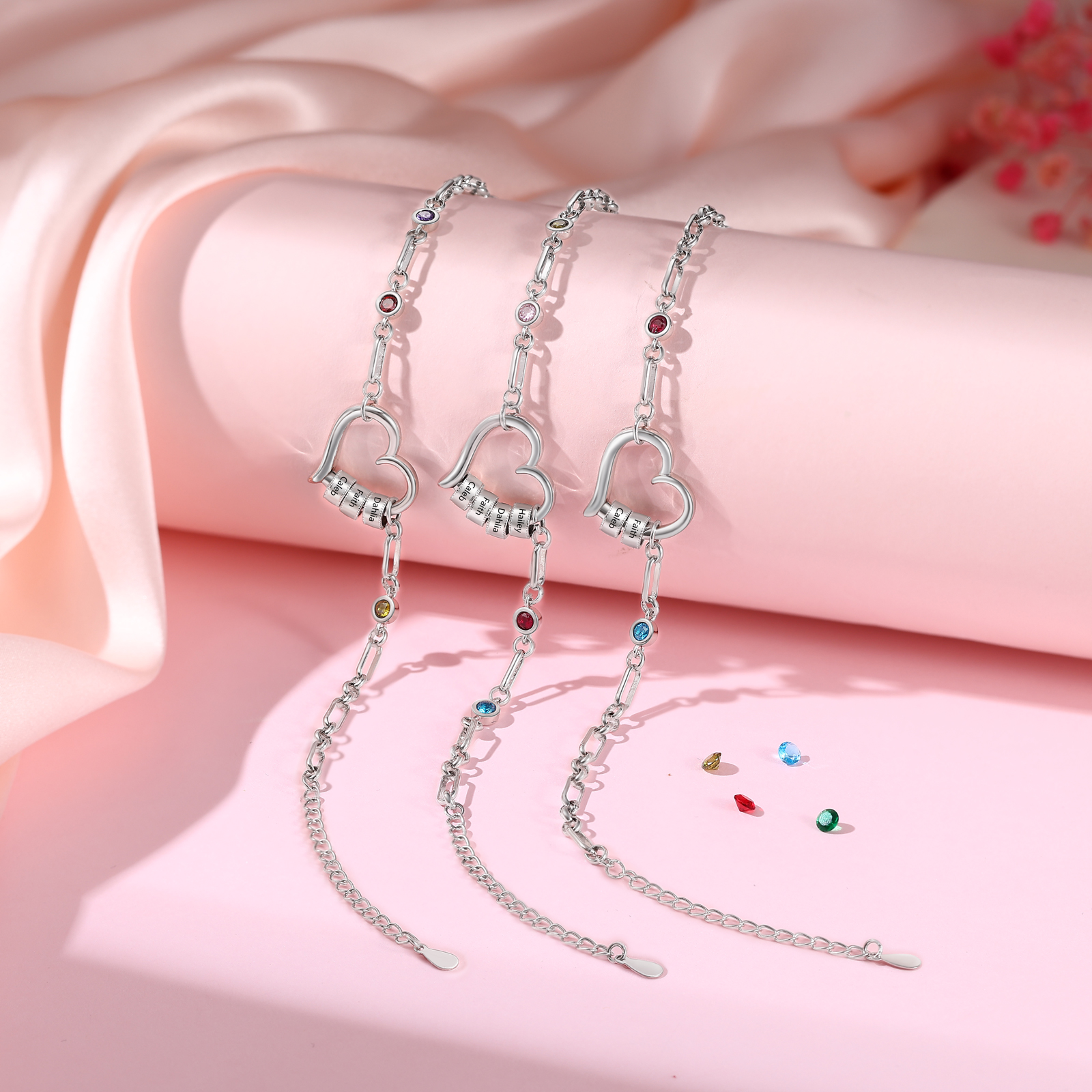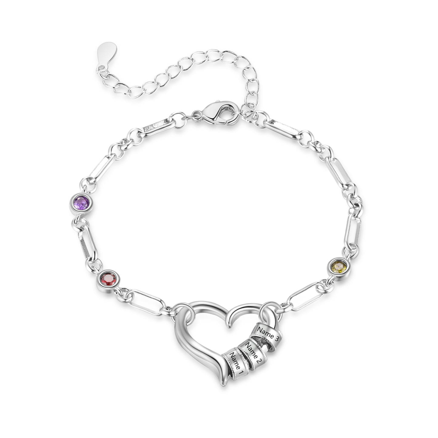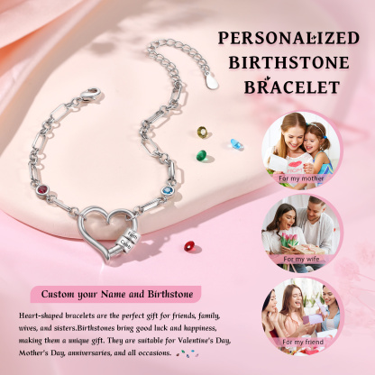 Give a heartwarming and practical gift with this personalized heart birthstone bracelet, lovingly made for moms, grandmas, daughters, sisters, or best friends. Customizable with engraved name beads and two sparkling birthstones, this elegant silver‑tone piece is both a stylish everyday accessory and a meaningful keepsake.