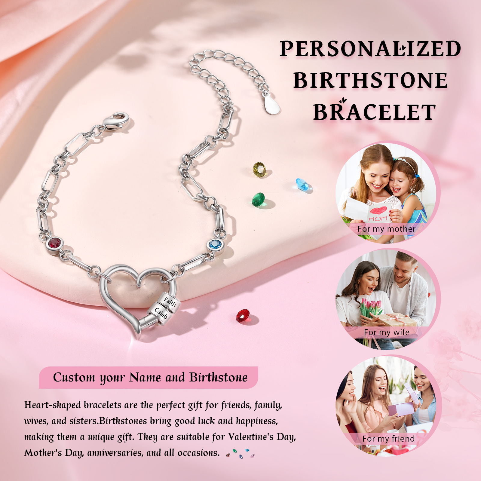 Keywords: personalized bracelet, birthstone bracelet, custom name bracelet, gift for mom, sentimental jewelry gift, adjustable heart bracelet, women’s keepsake, engraved bracelet UK