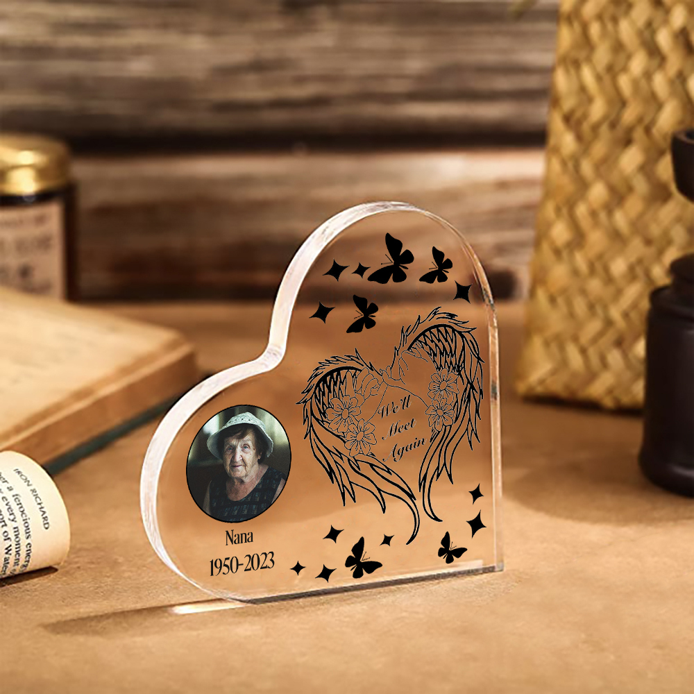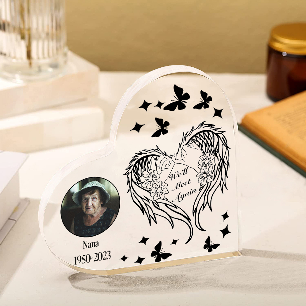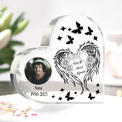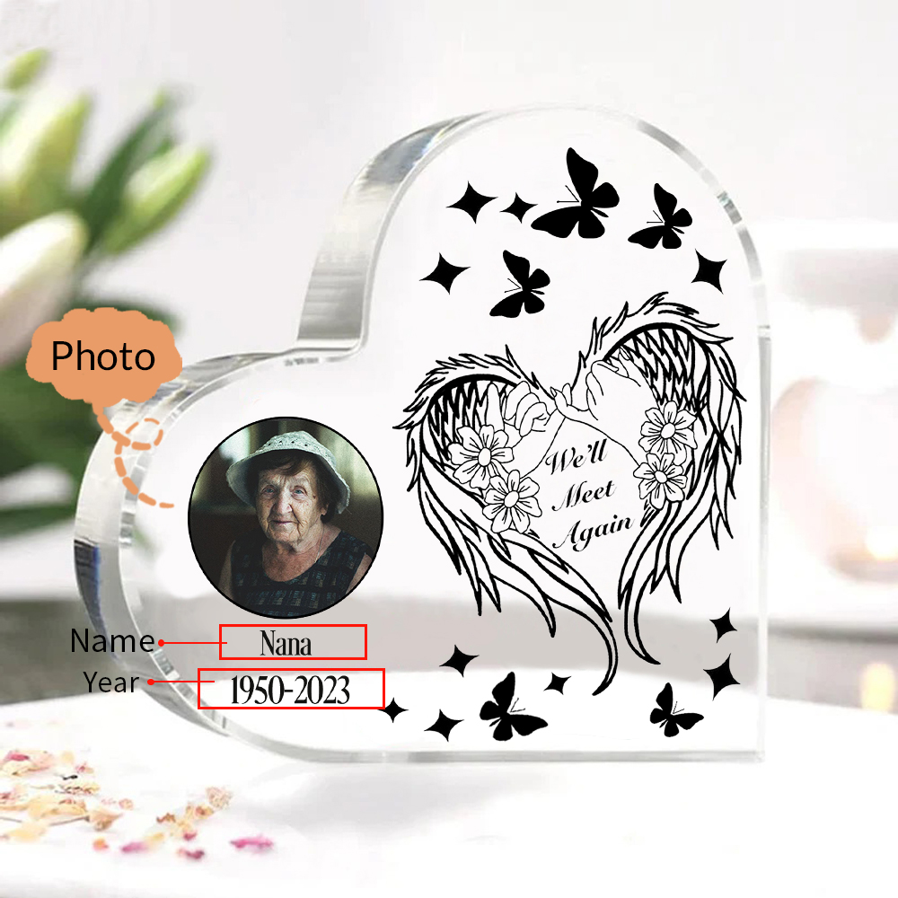 Personalized Angel Wings Memorial Gift-Custom Memorial Acrylic Heart Keepsake Desktop Ornament-We'll Meet Again