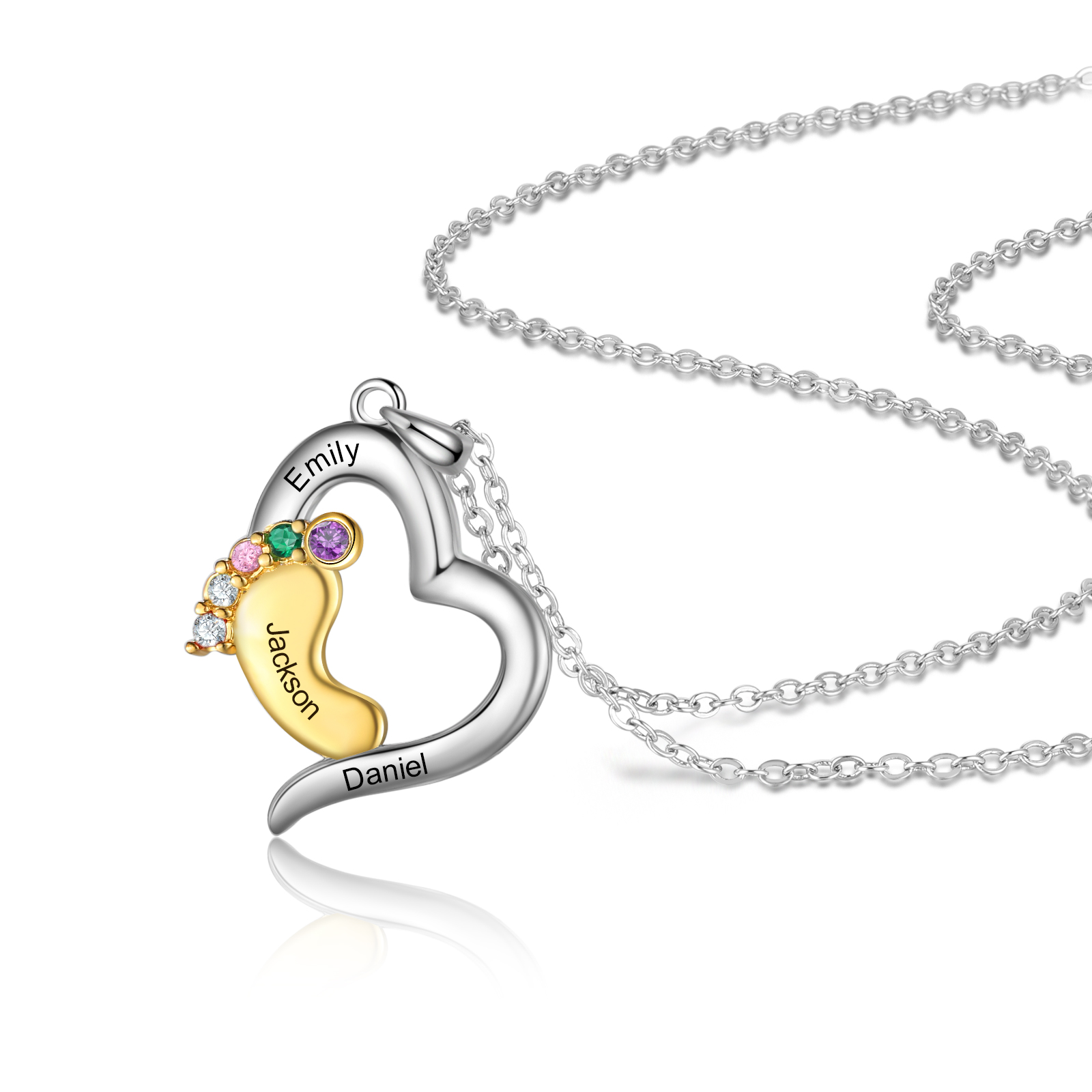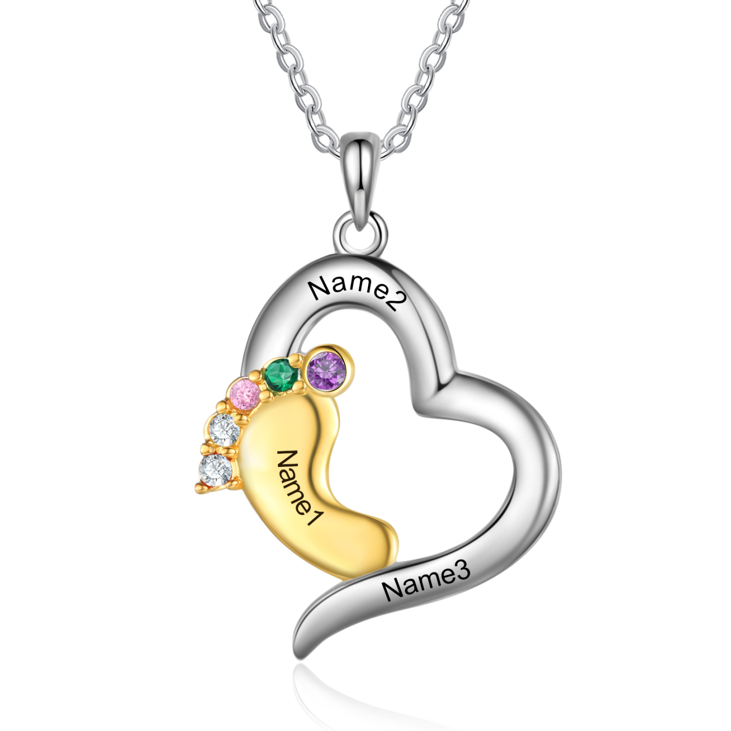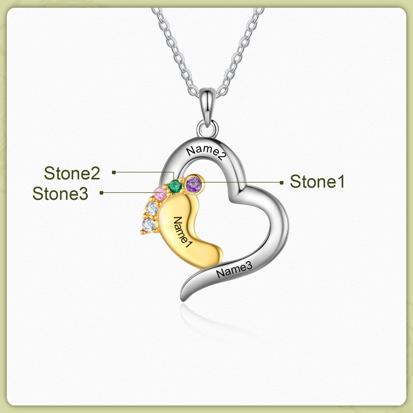 Personalized Baby Feet Necklace with Names Custom 3 Birthstones Heart Necklace Gifts for Women