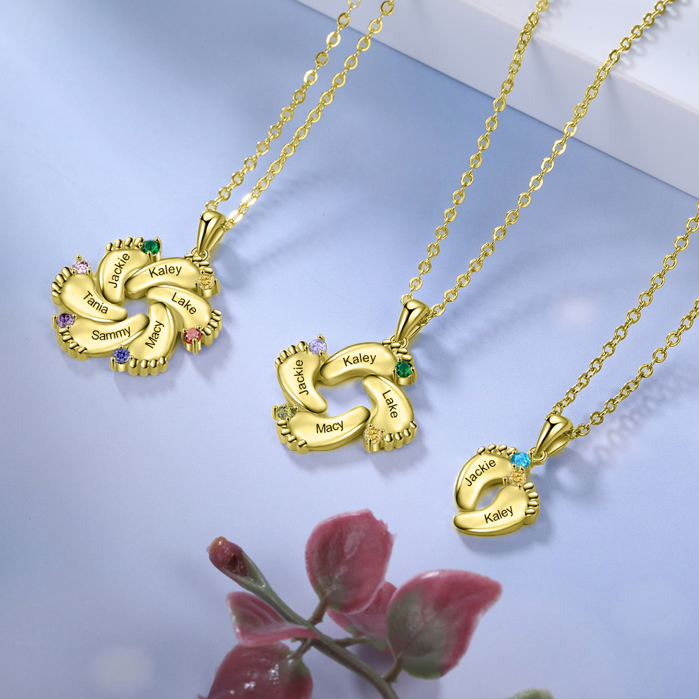 💗 Moms love anything that celebrates their children, not to mention this lovely Baby Feet Necklace of great quality, meant to last a long time. Celebrate the miracle of birth with this commemorative necklace. Engrave up to 6 baby feet charms with the names or dates of the children and birthstone on each pendant.