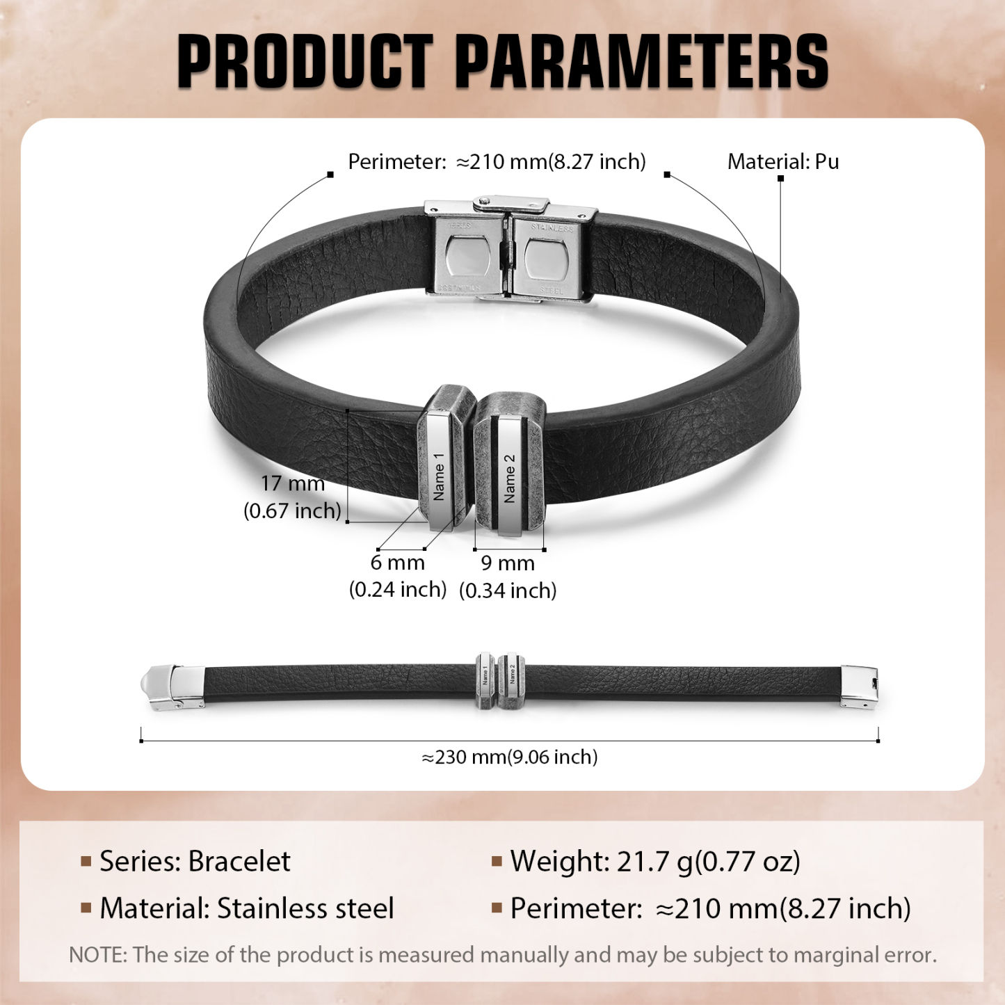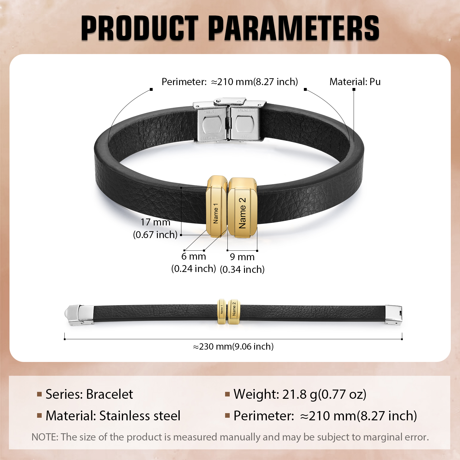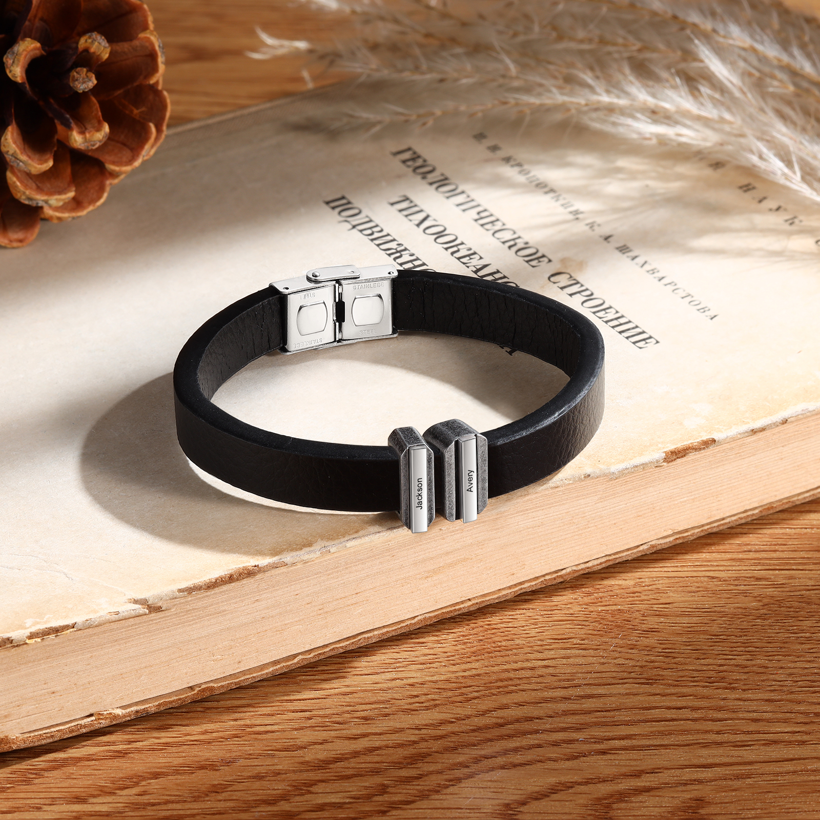2 Names Personalized Stainless Steel Leather Bracelet Engraved Name Men's Bracelet Gift for Dad