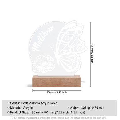 - Supplied with a USB cable Acrylic name plaque, wooden light base with USB cable