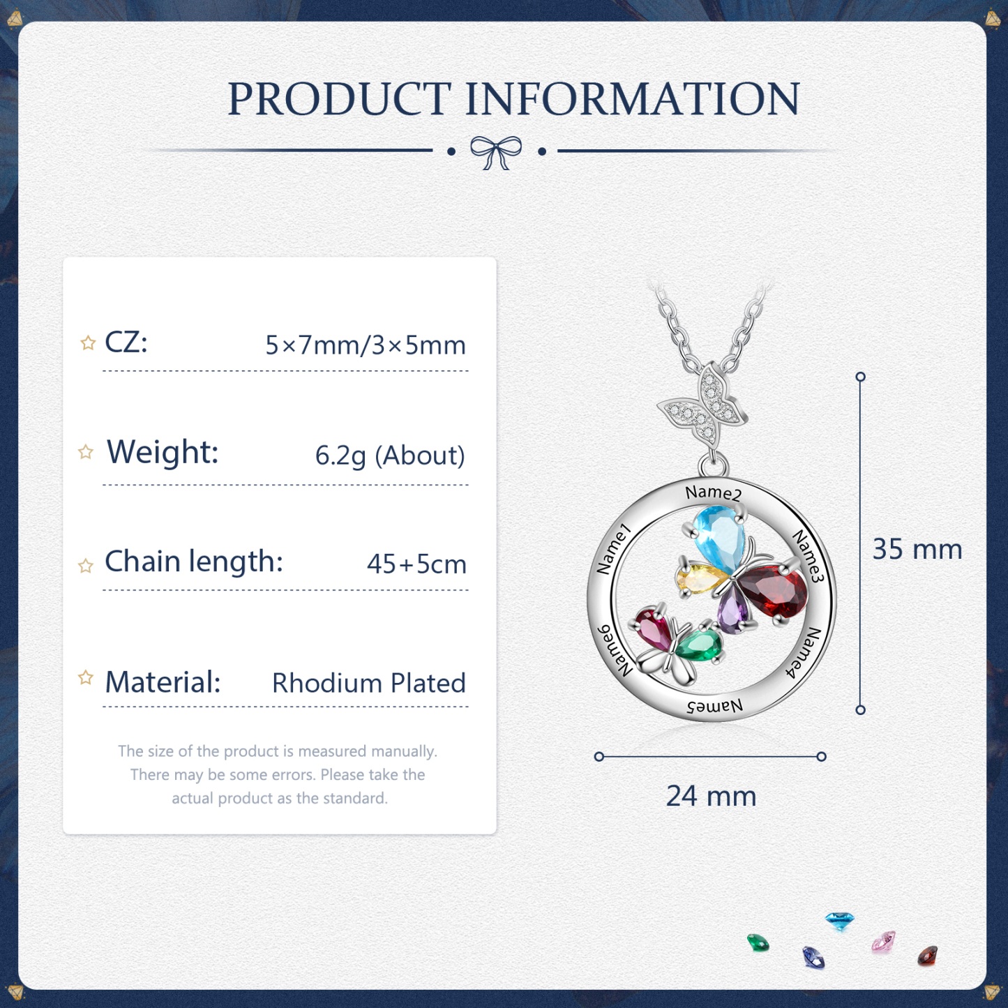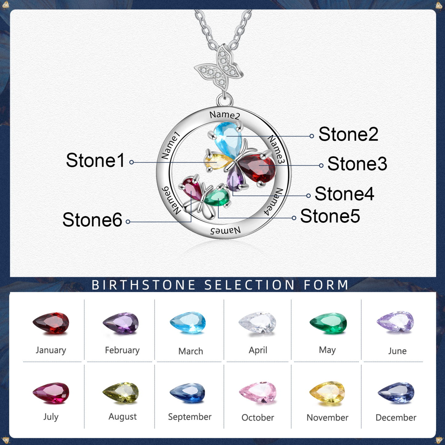 - Personalization: 6 Names, 6 Birthstones