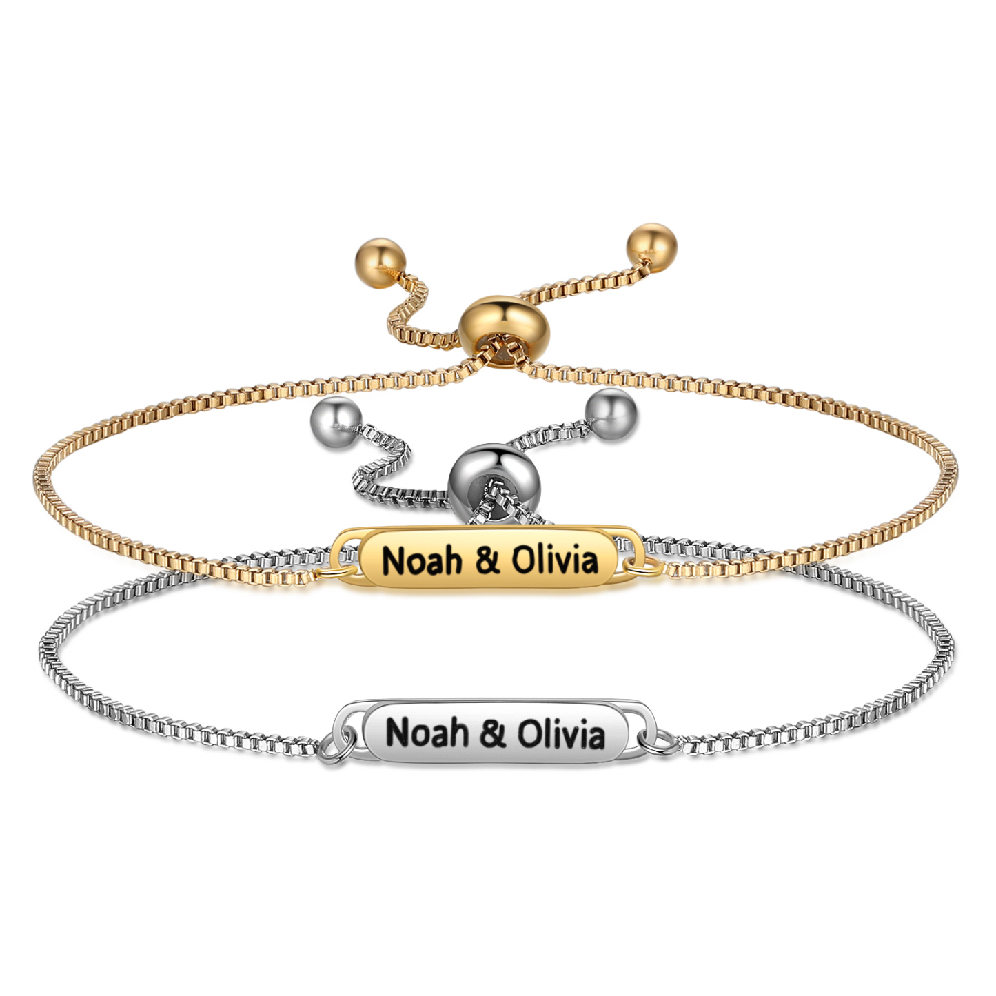 - Two Adjustable Bracelets: One gold and one silver, engraved with your personalized names.