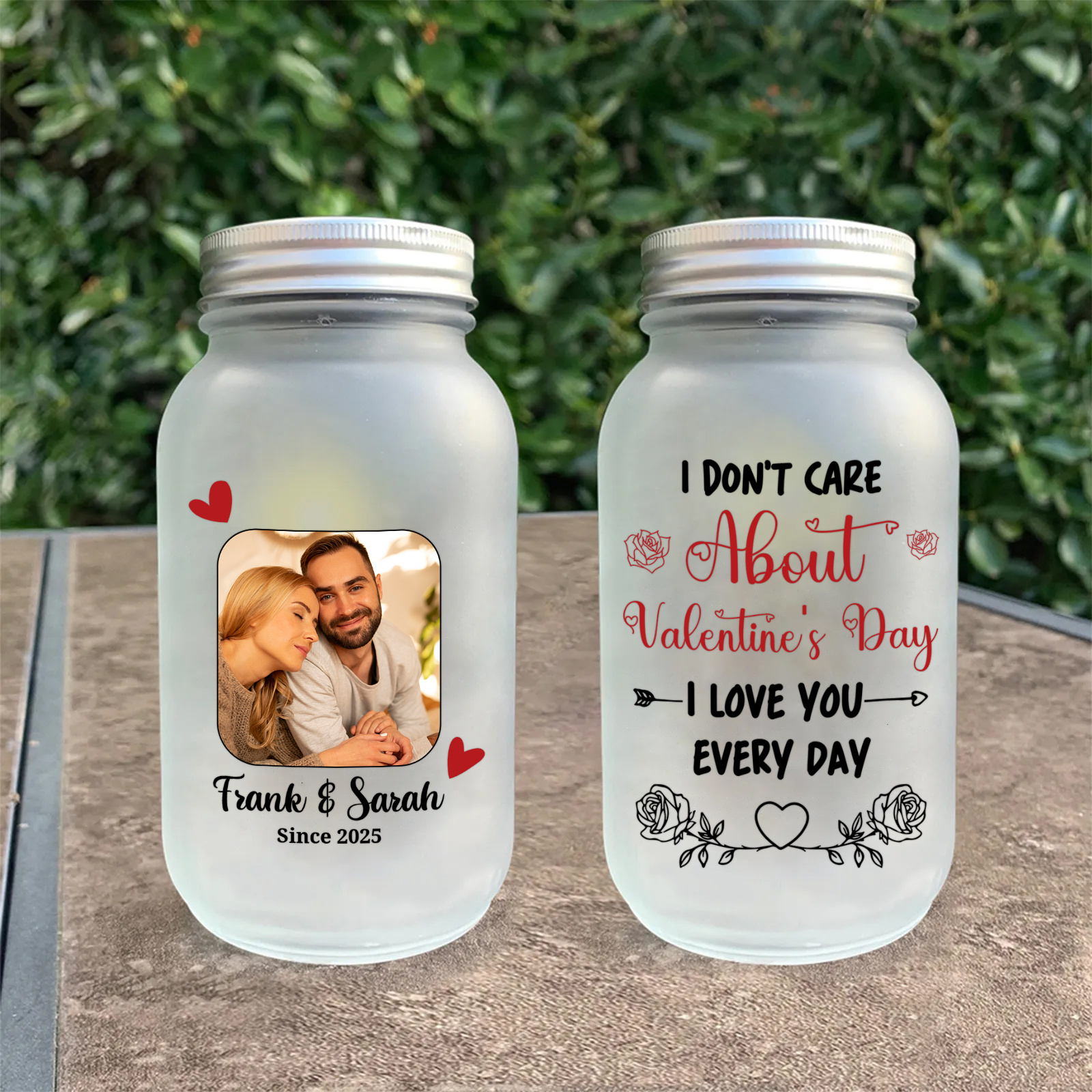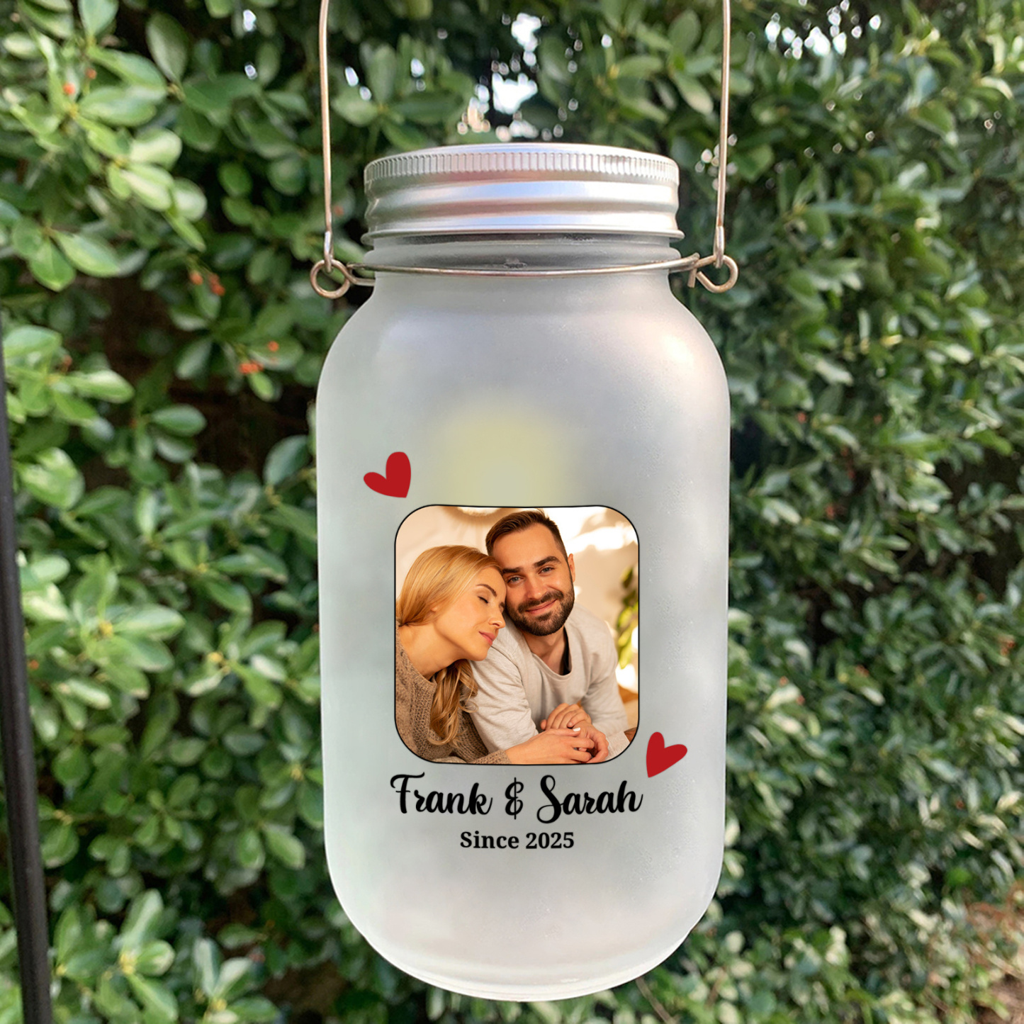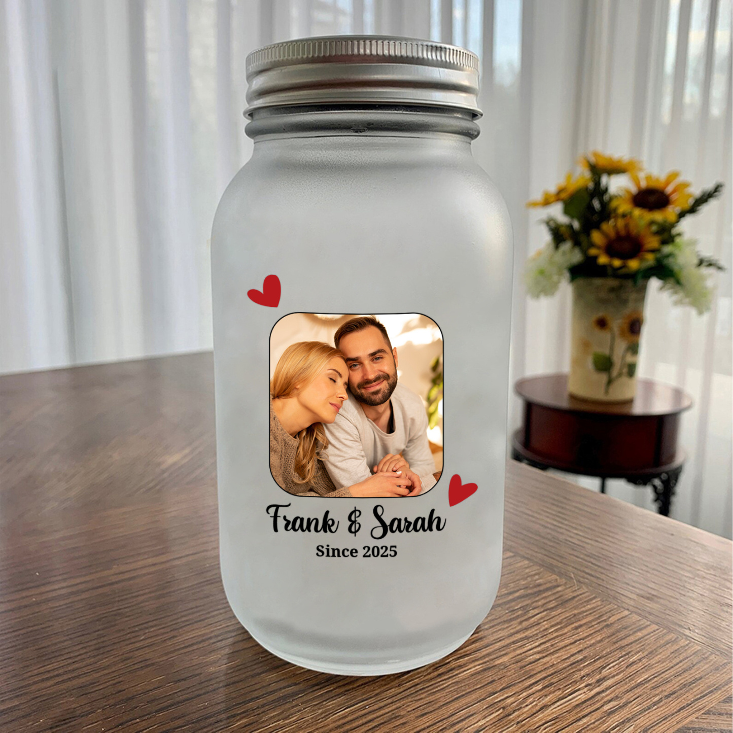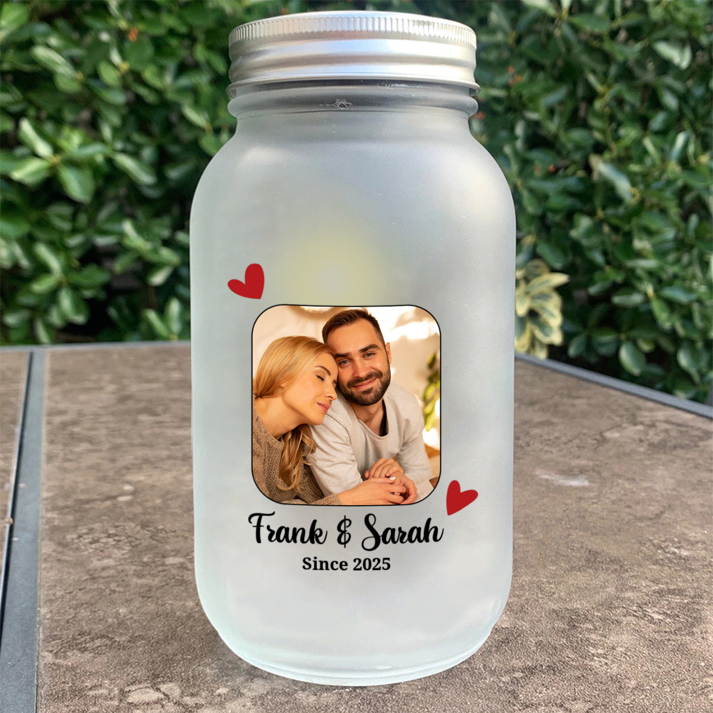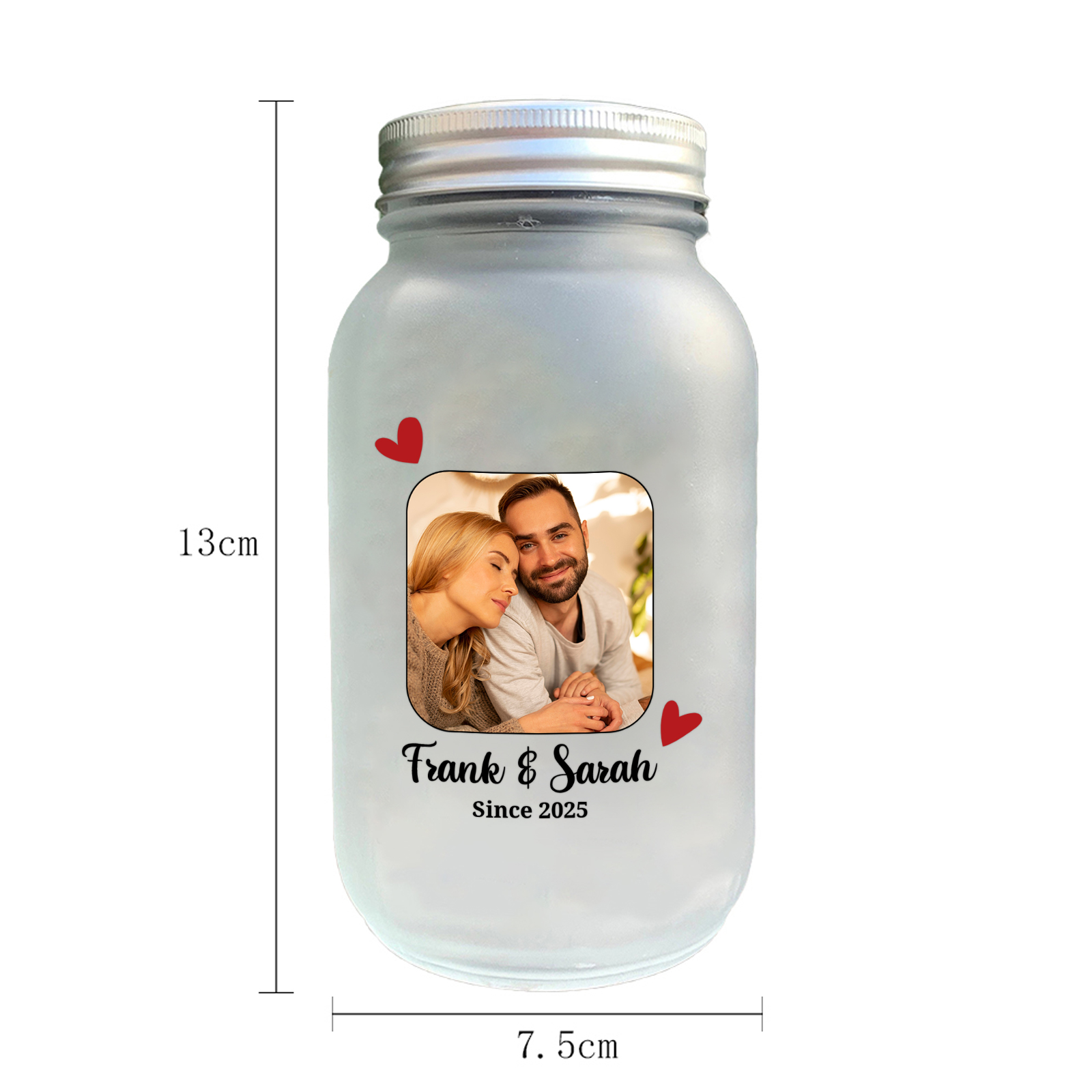 - Frosted glass jar with custom photo, 2 names and year
