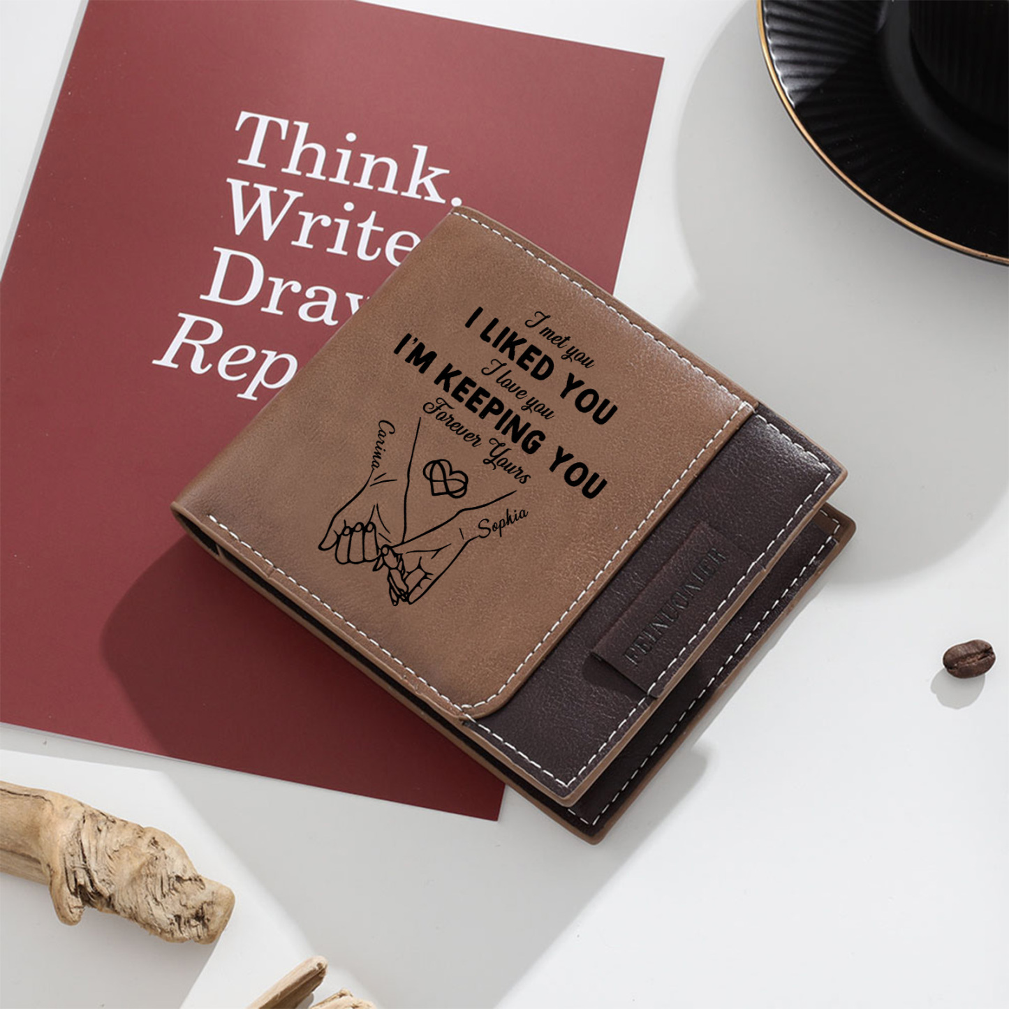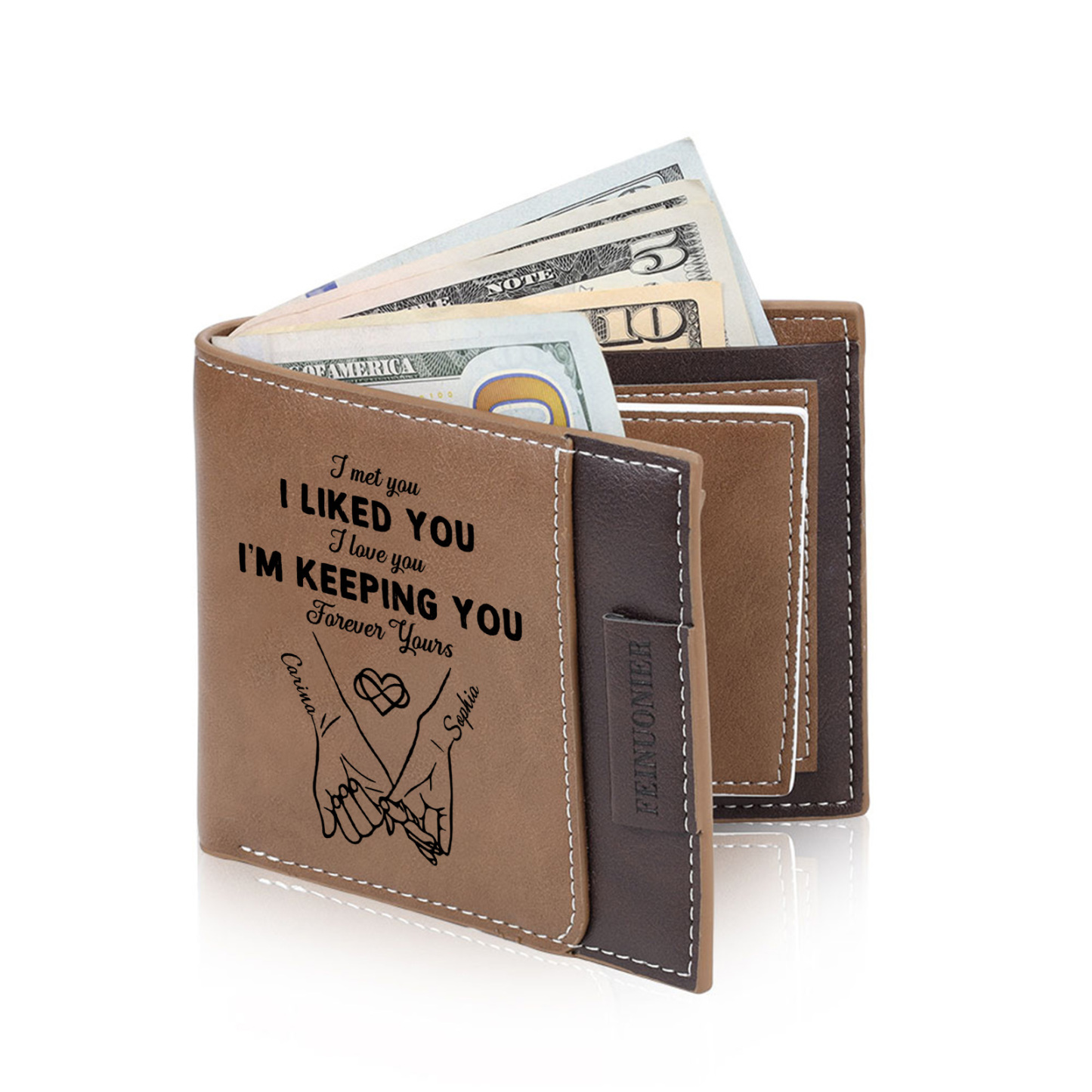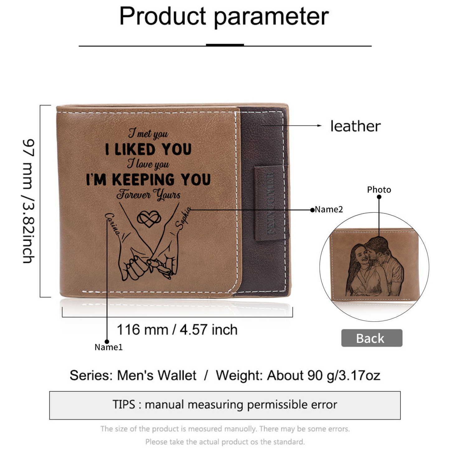 - Classic bifold wallet with engraved names, quote, and couple illustration