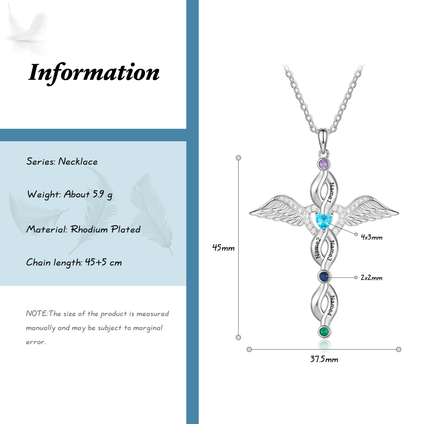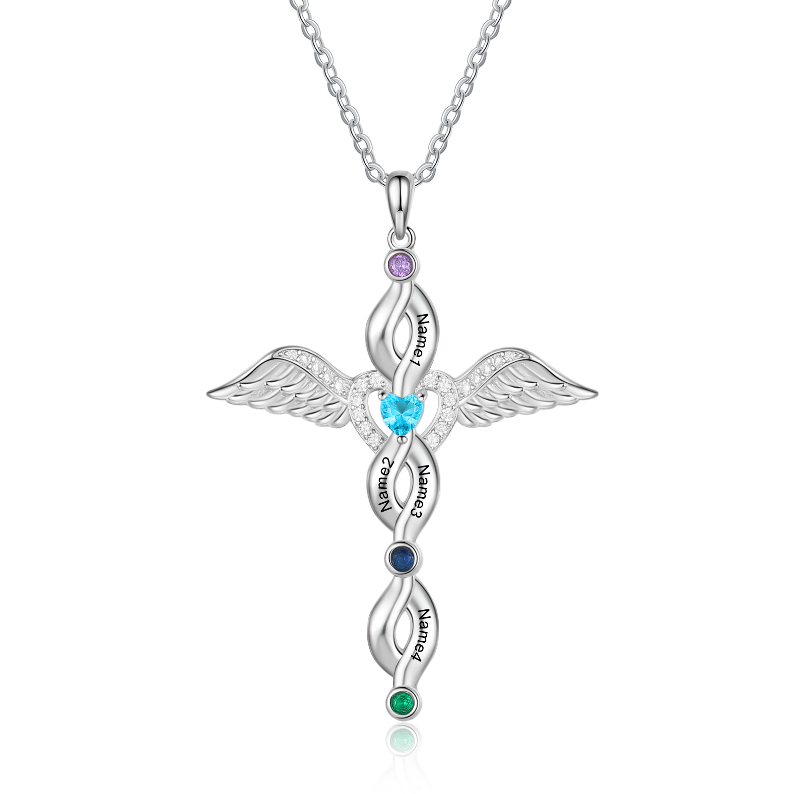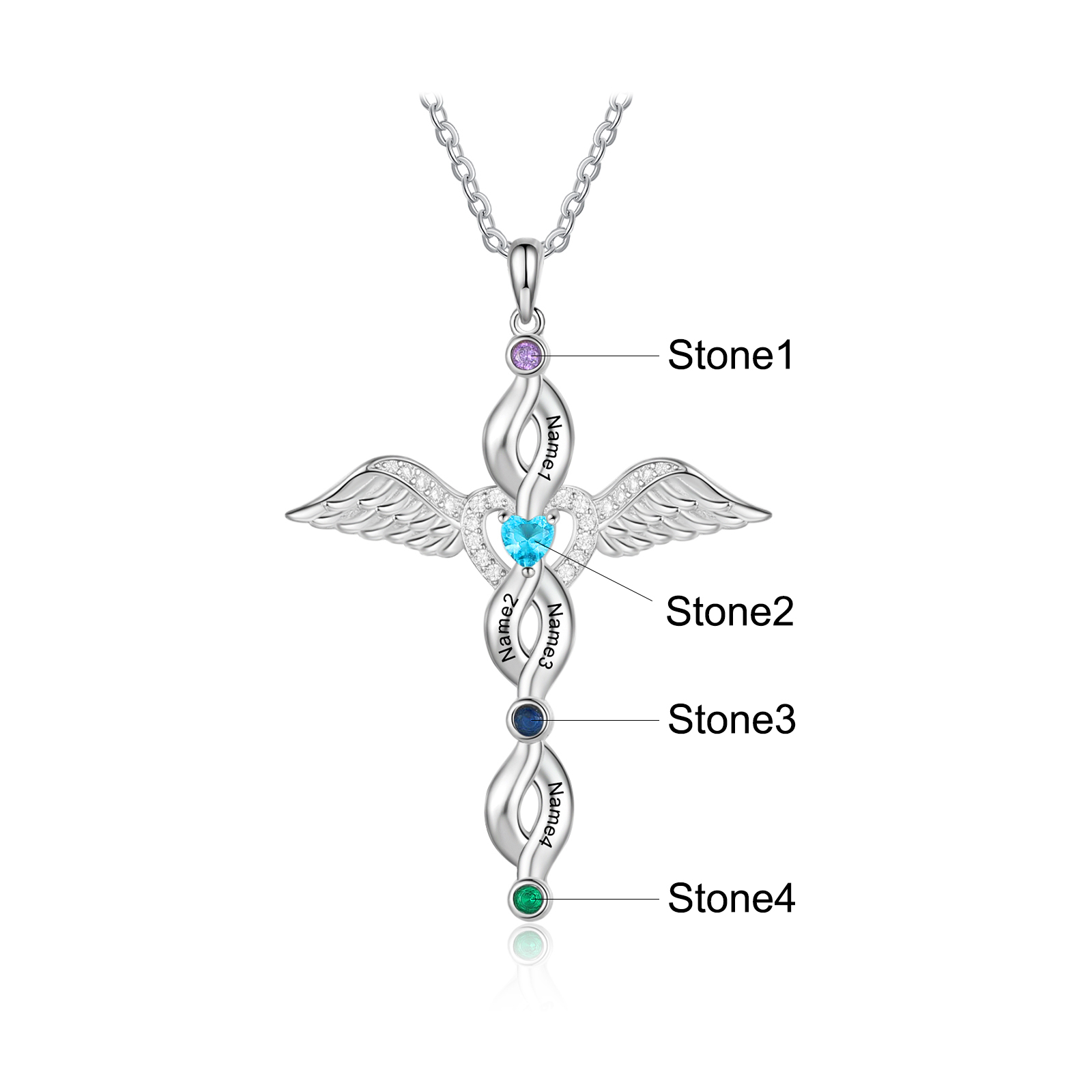 Personalized Cross Necklace With Names Custom 4 Birthstones Wings Necklace Gifts for Her