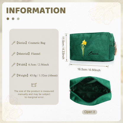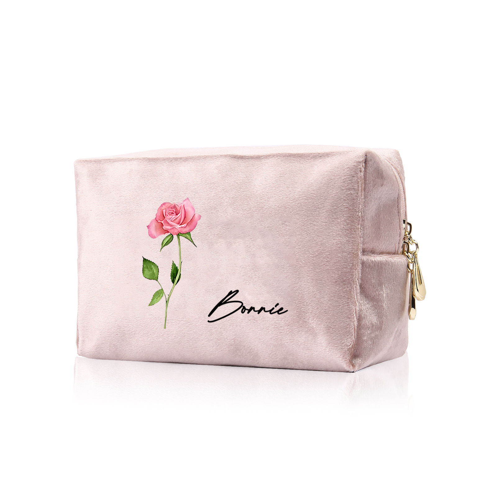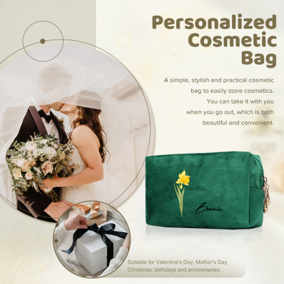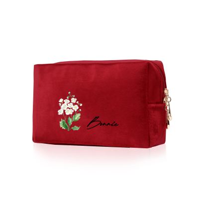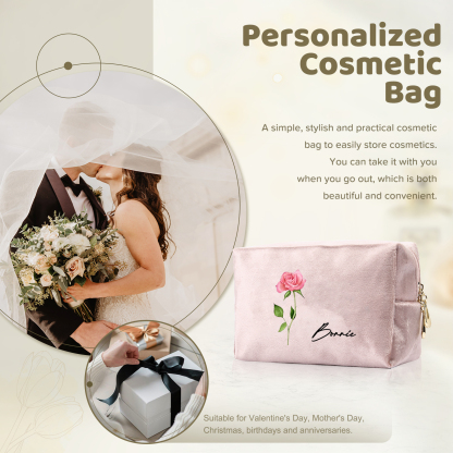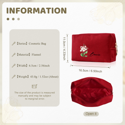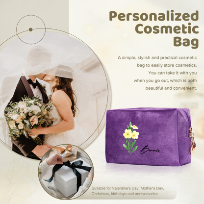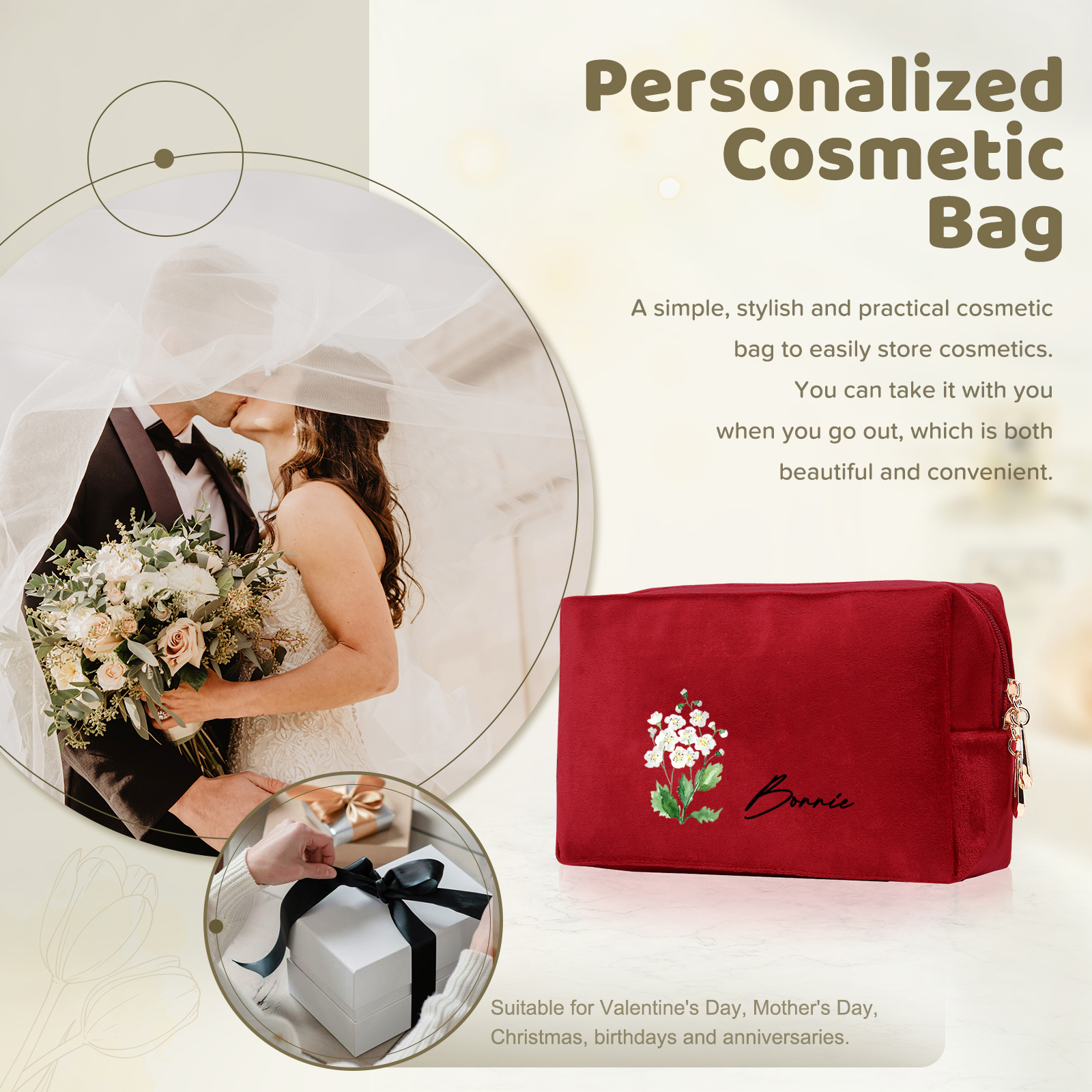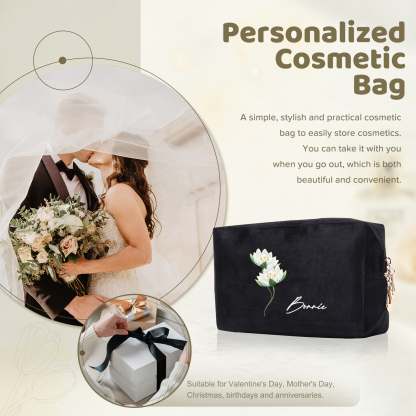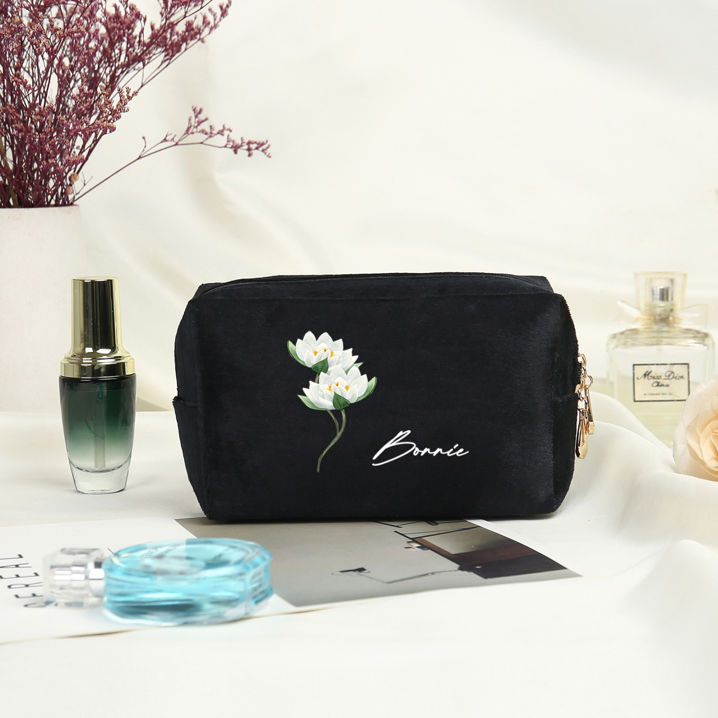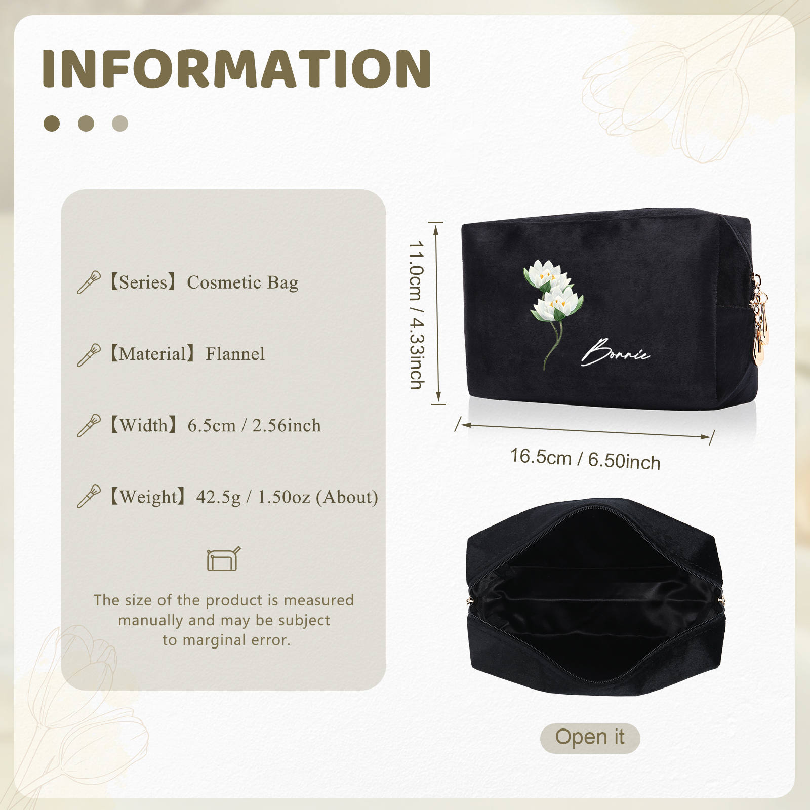 Personalized Custom 1 Name And 1 Birthflower Cosmetic Bag, Custom Flannel Cosmetic Bag, Personalized Gift In Multiple Colors