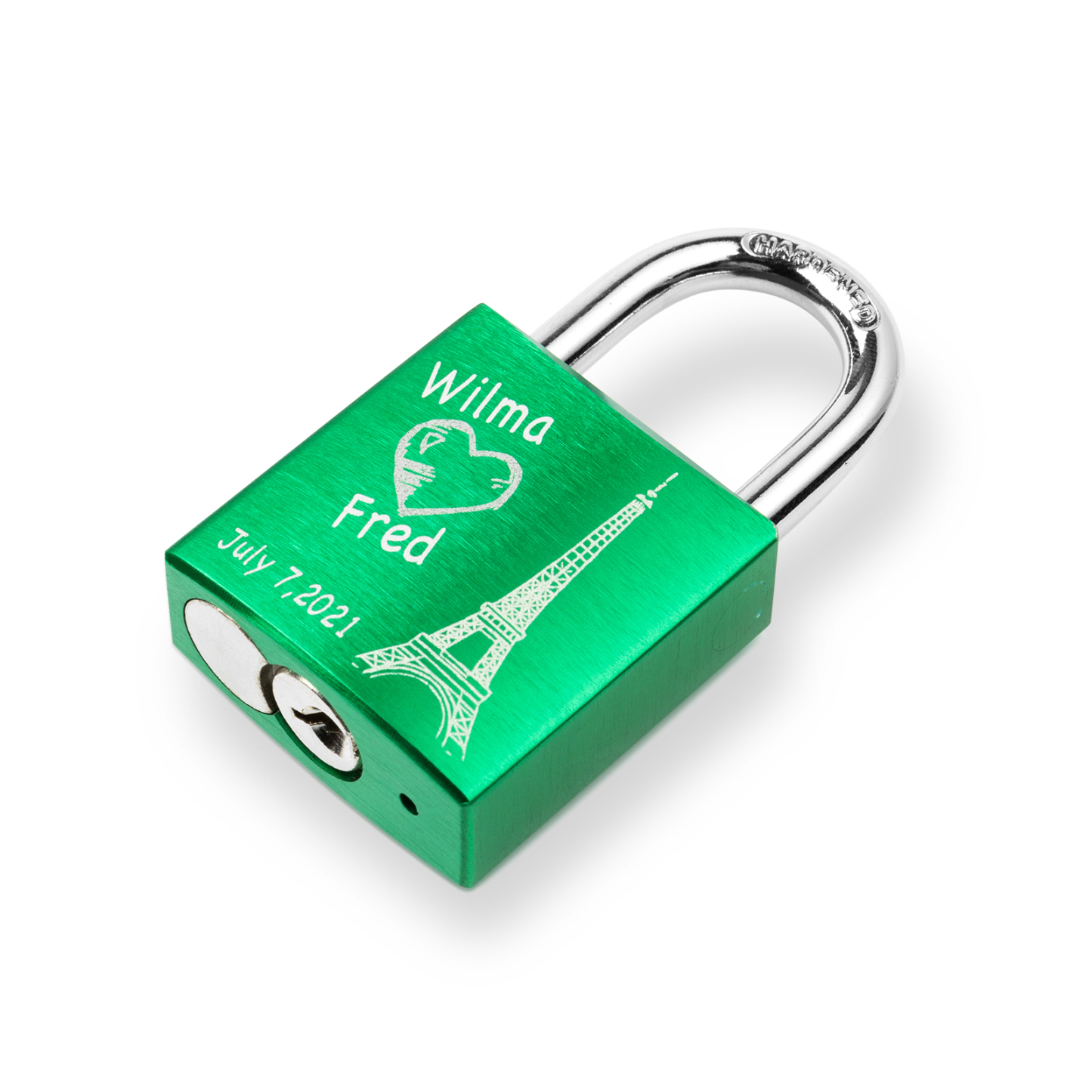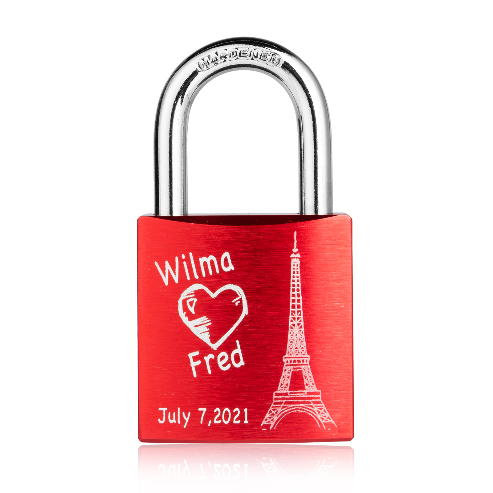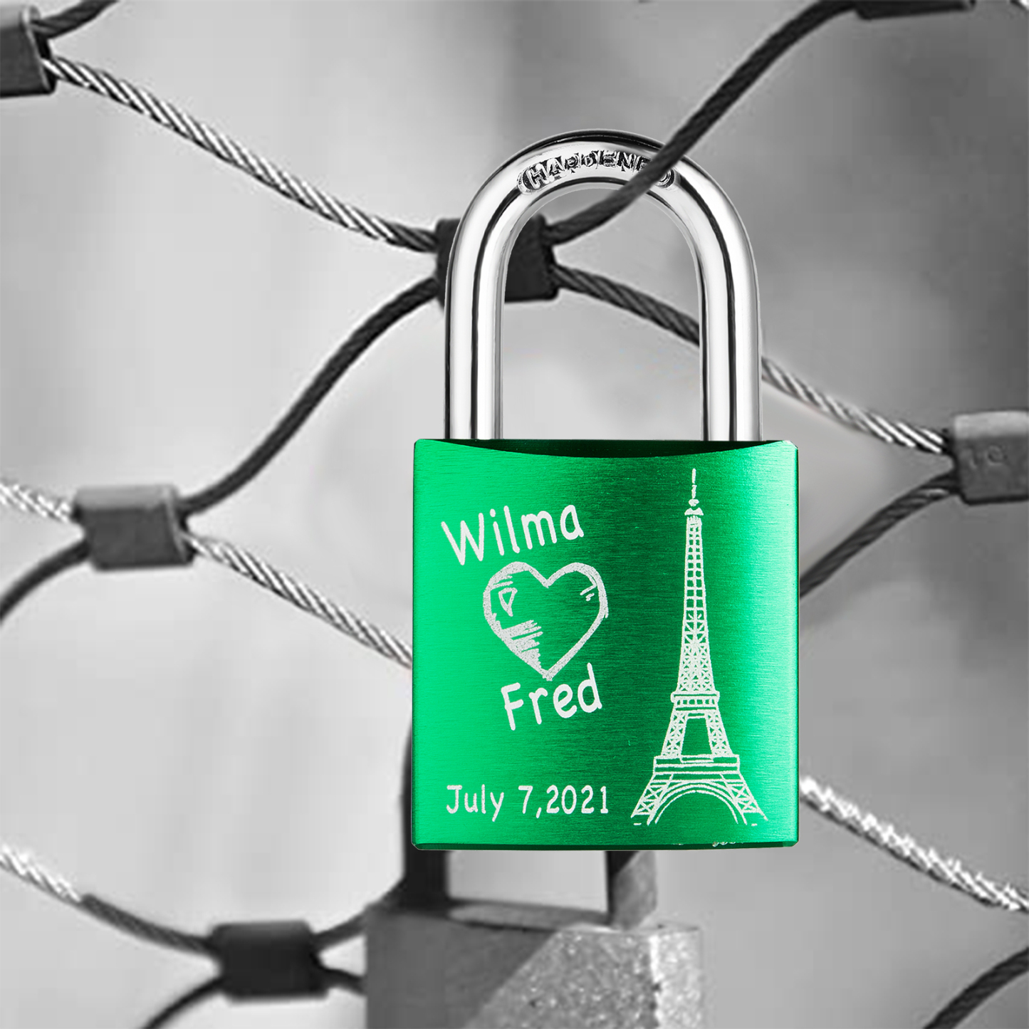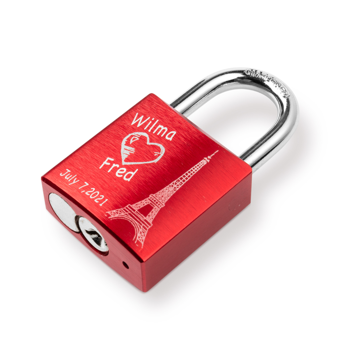 Our locks are engraved by a laser engraver to creat permanent, clean, and beautiful inscriptions. A high intensity laser removes the anodized color of the lock, leaving behind the bright exposed aluminum.