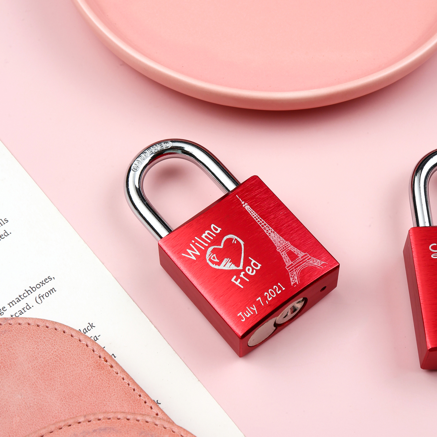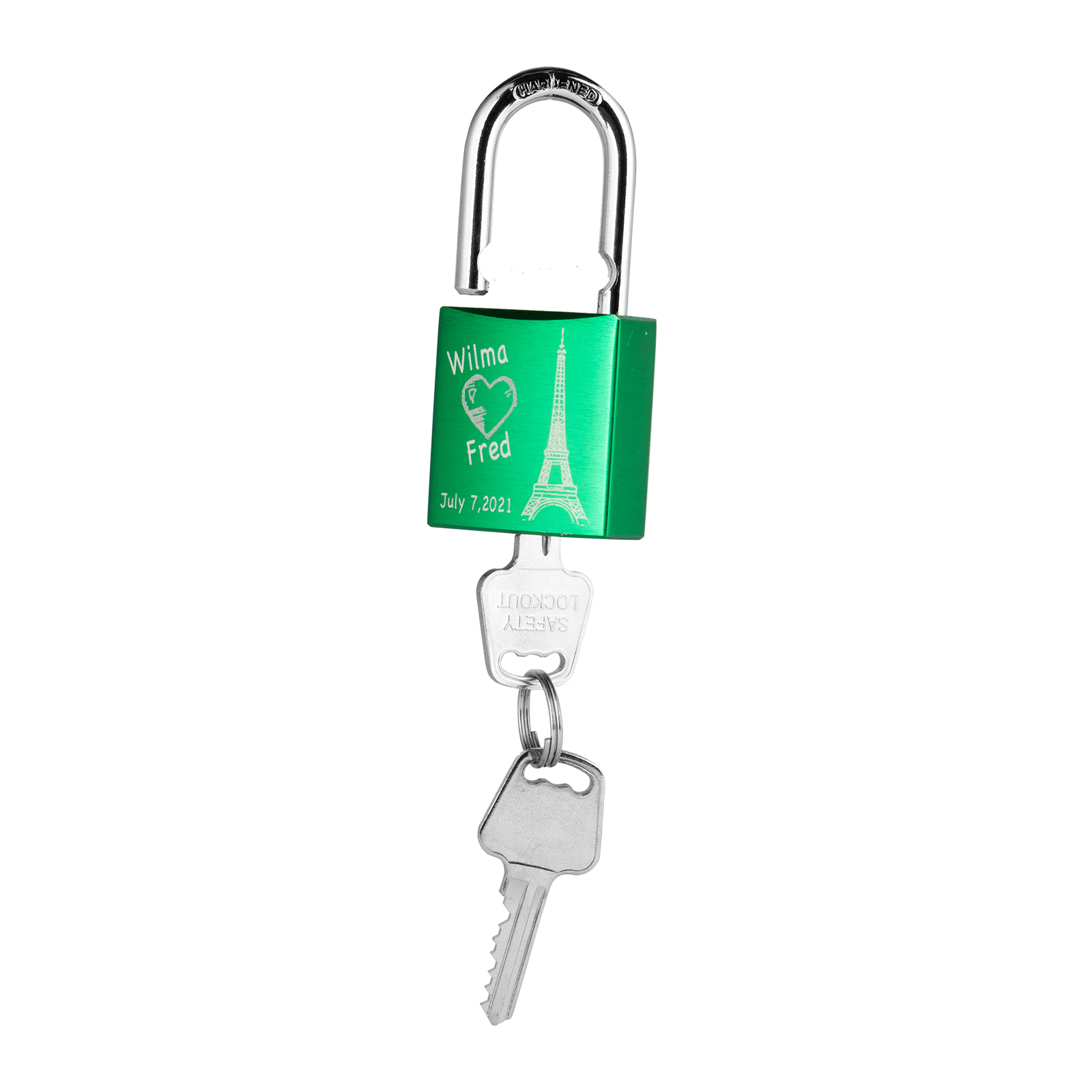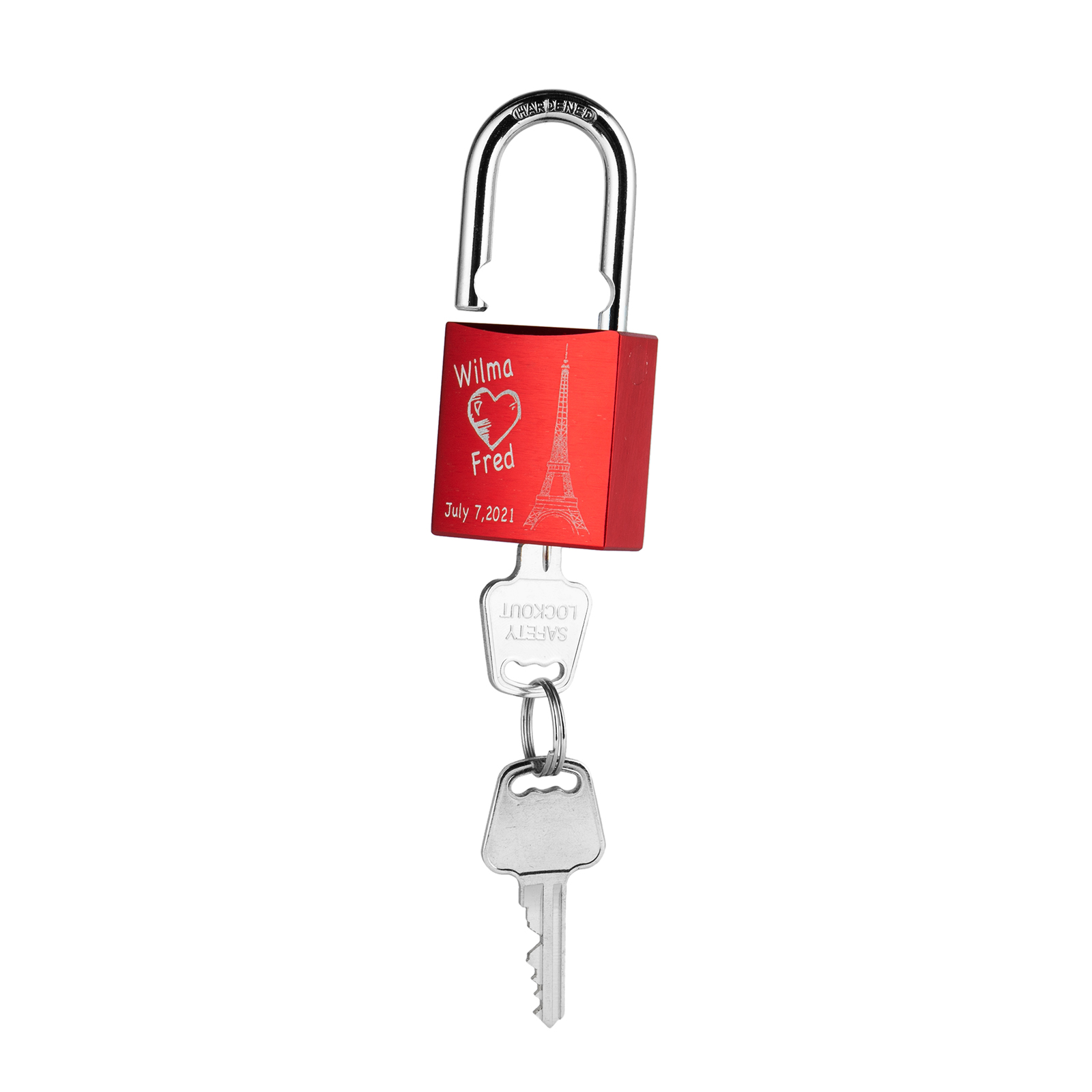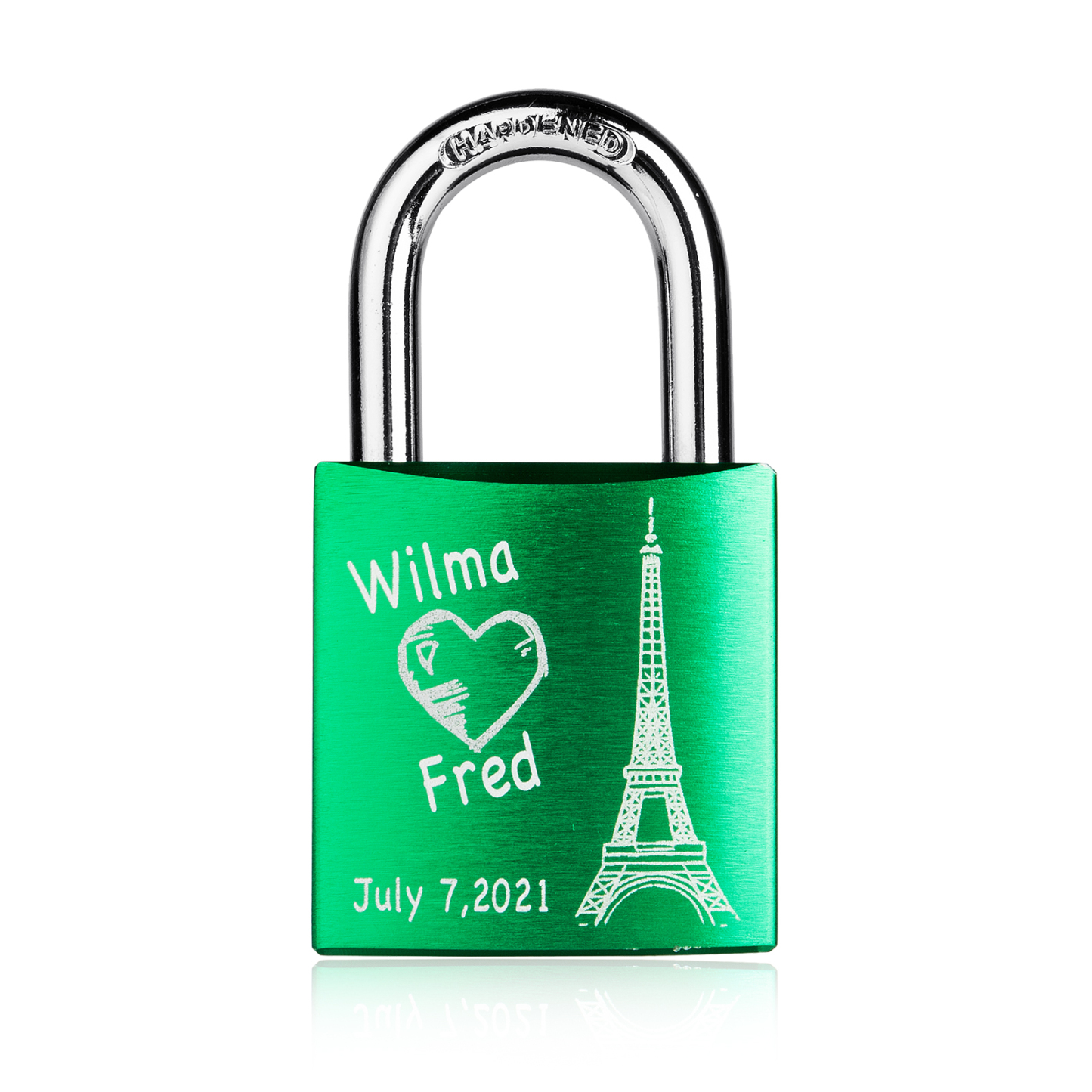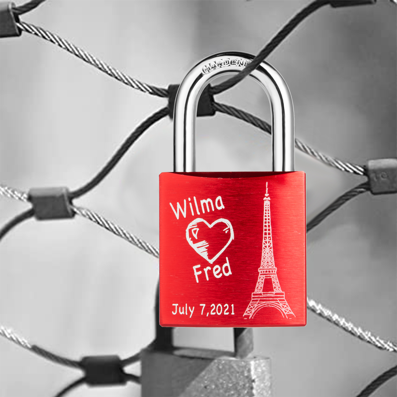 Our locks are engraved by a laser engraver to creat permanent, clean, and beautiful inscriptions. A high intensity laser removes the anodized color of the lock, leaving behind the bright exposed aluminum.