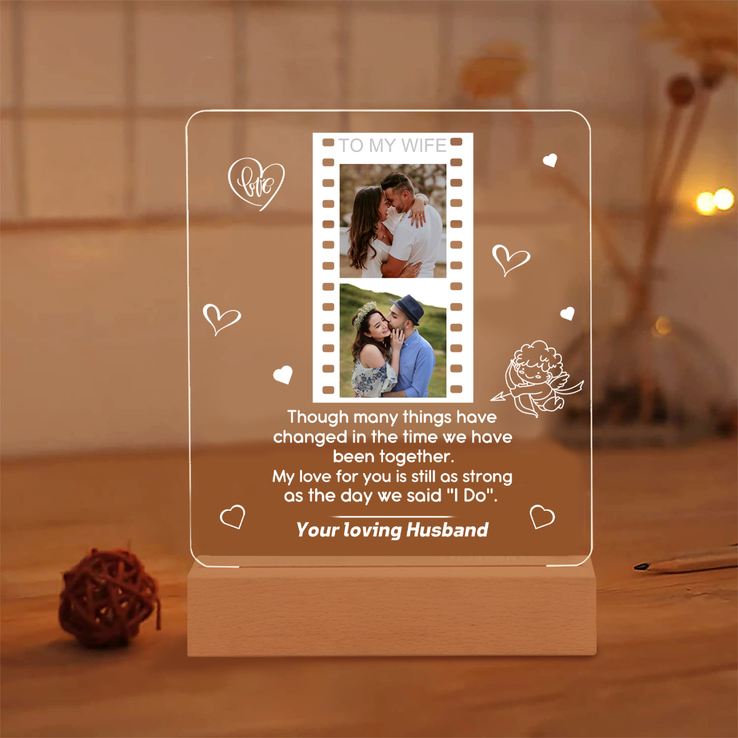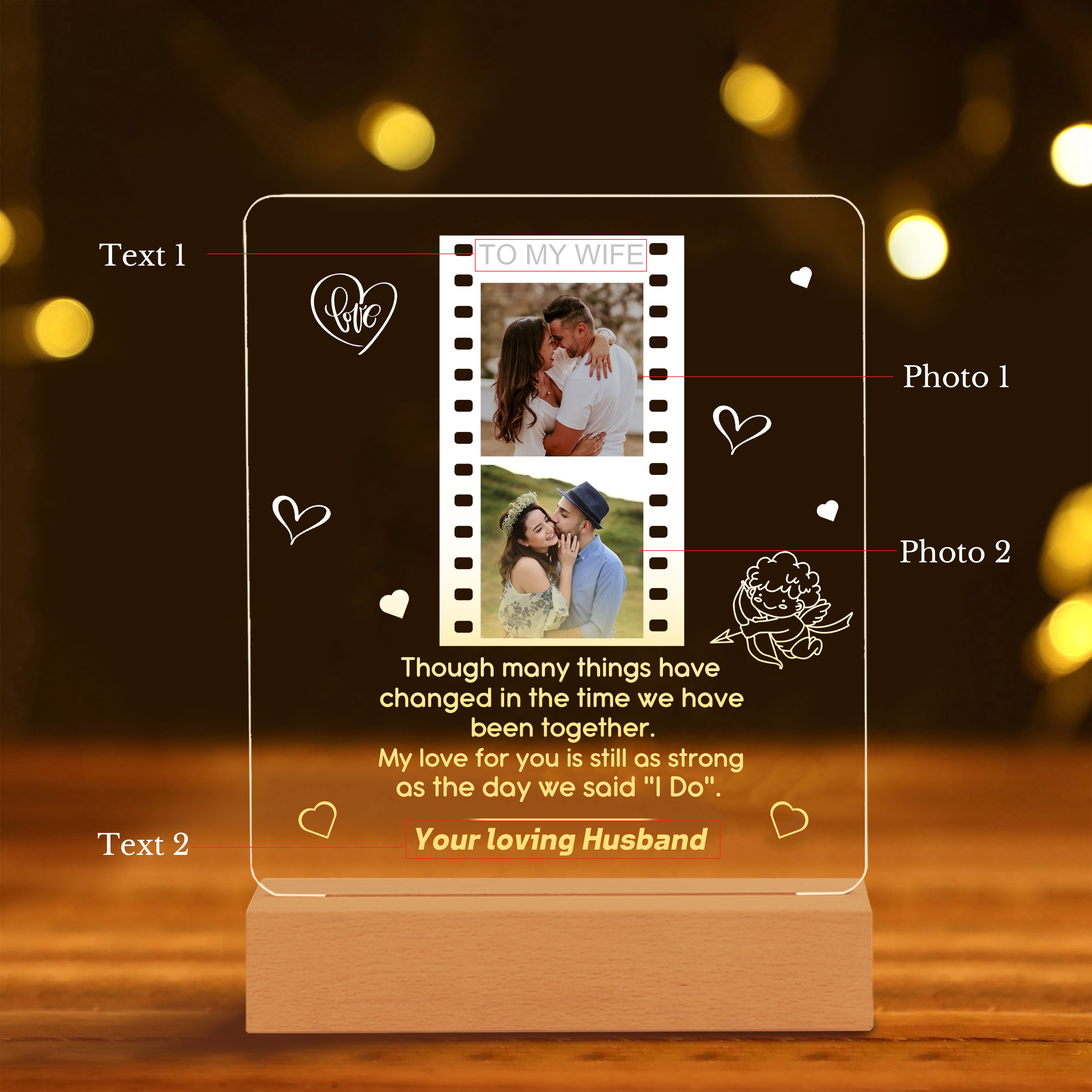 -Add your Family's or couple's photos to the night light that creates a unique bedside companion for your loved ones that will proudly grace their bedside for many years to come!