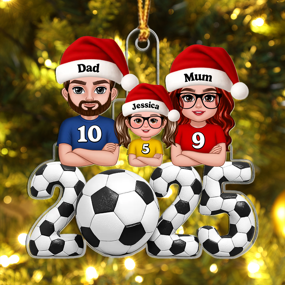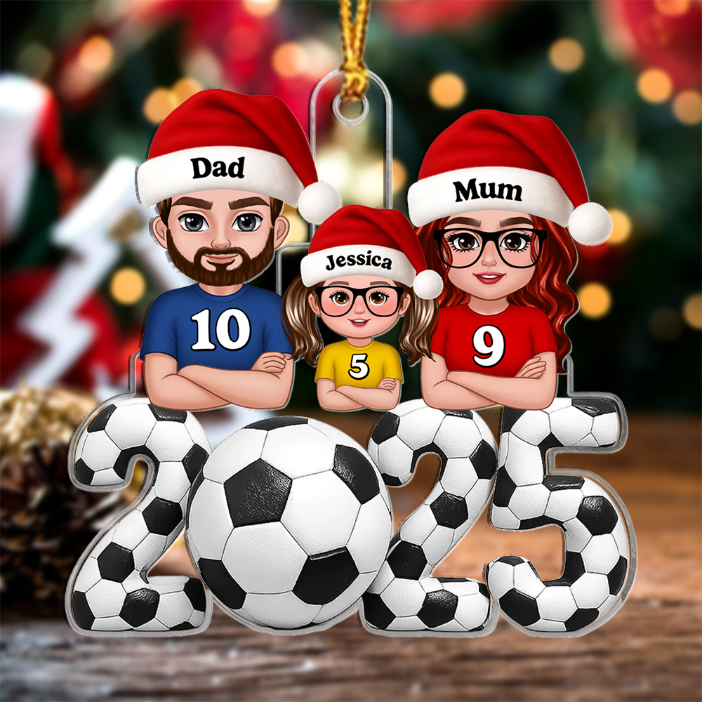 Give a heartfelt and useful gift with this personalized 2025 football family Christmas ornament—perfect for dads, mums, kids, grandparents or any football fan. Add names and shirt numbers to each character in Santa hats for a tree decoration that’s both festive and full of meaning.