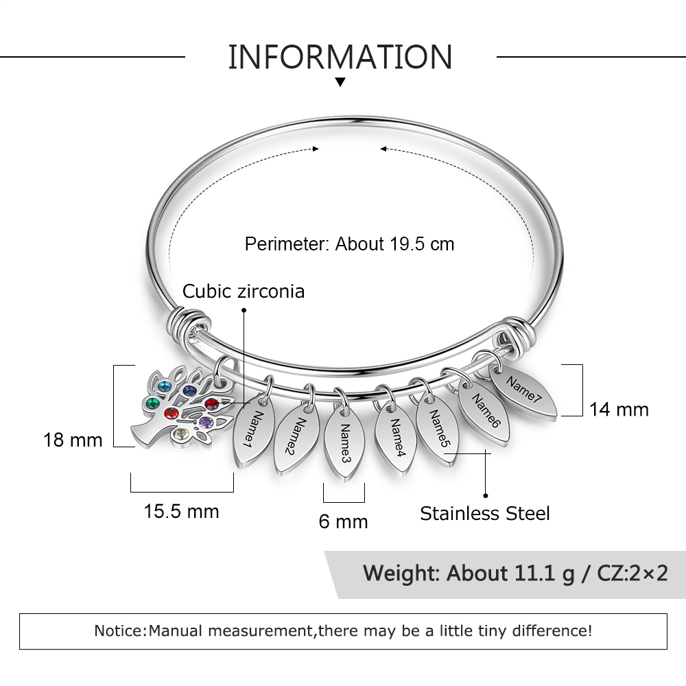 Personalized Family Tree Bracelet with 7 Birthstones Leaf Charms Bangle for Her