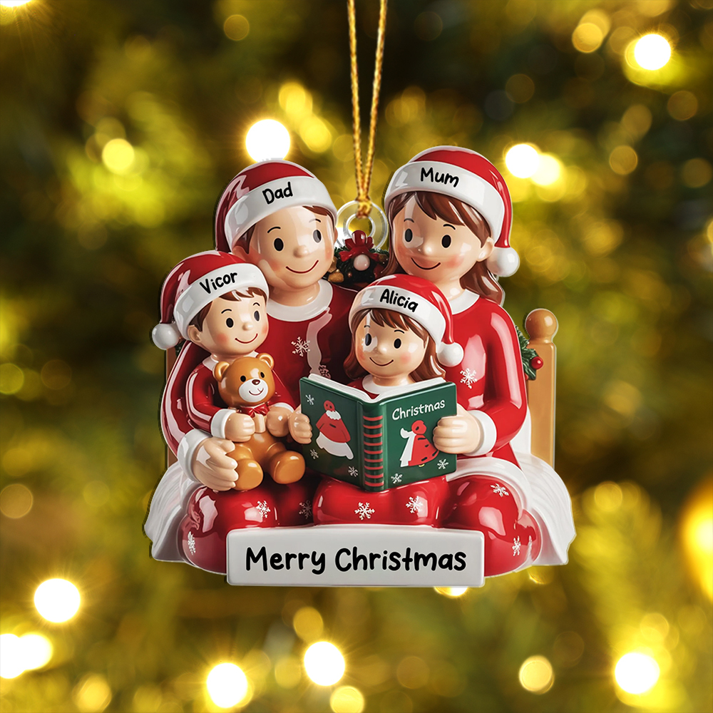 Give a heartfelt and useful gift with this personalized family Christmas ornament, perfect for parents, grandparents, or any loved ones who cherish together-time. Add 4 names to the hats and banner to capture your family story—an ornament that brings warmth to the tree and smiles year after year.