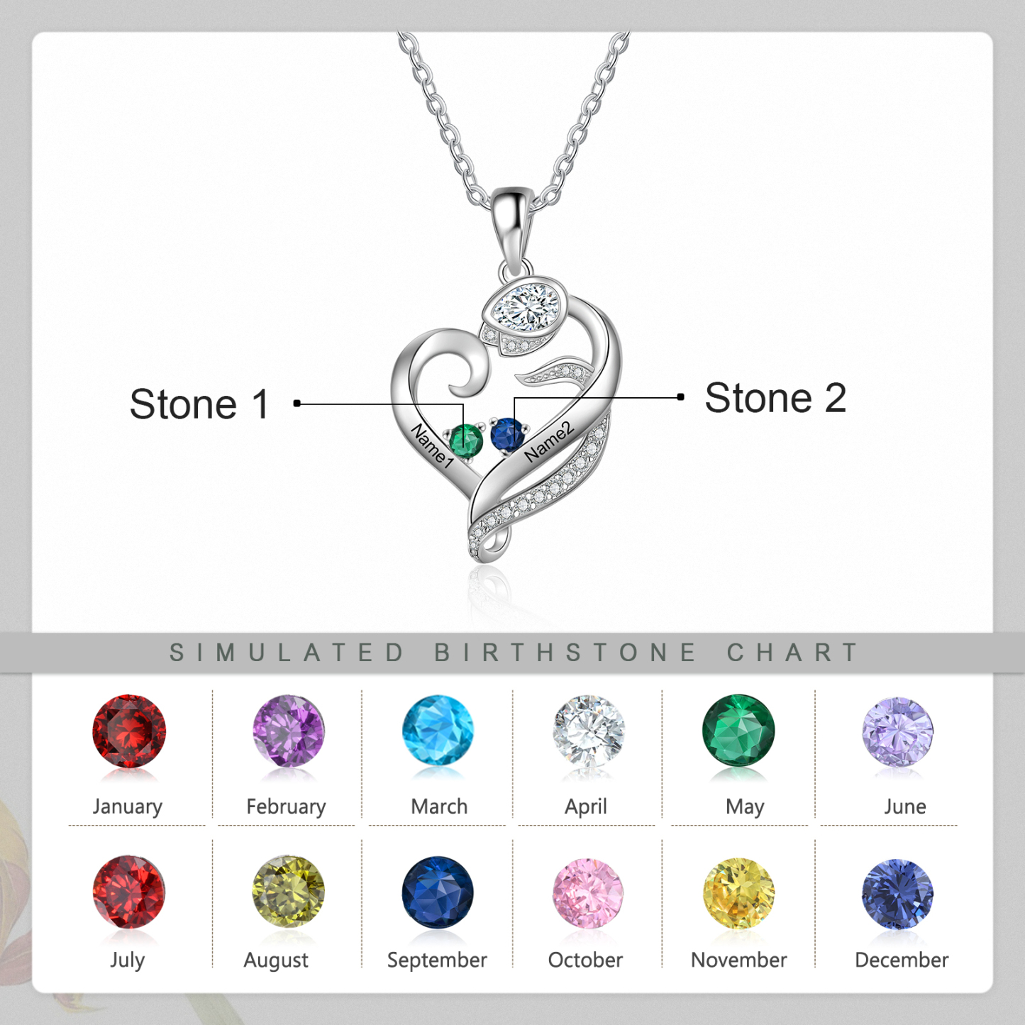 Personalized Flower Heart Necklace With 2 Birthstones Custom Names Necklace Gift For Her