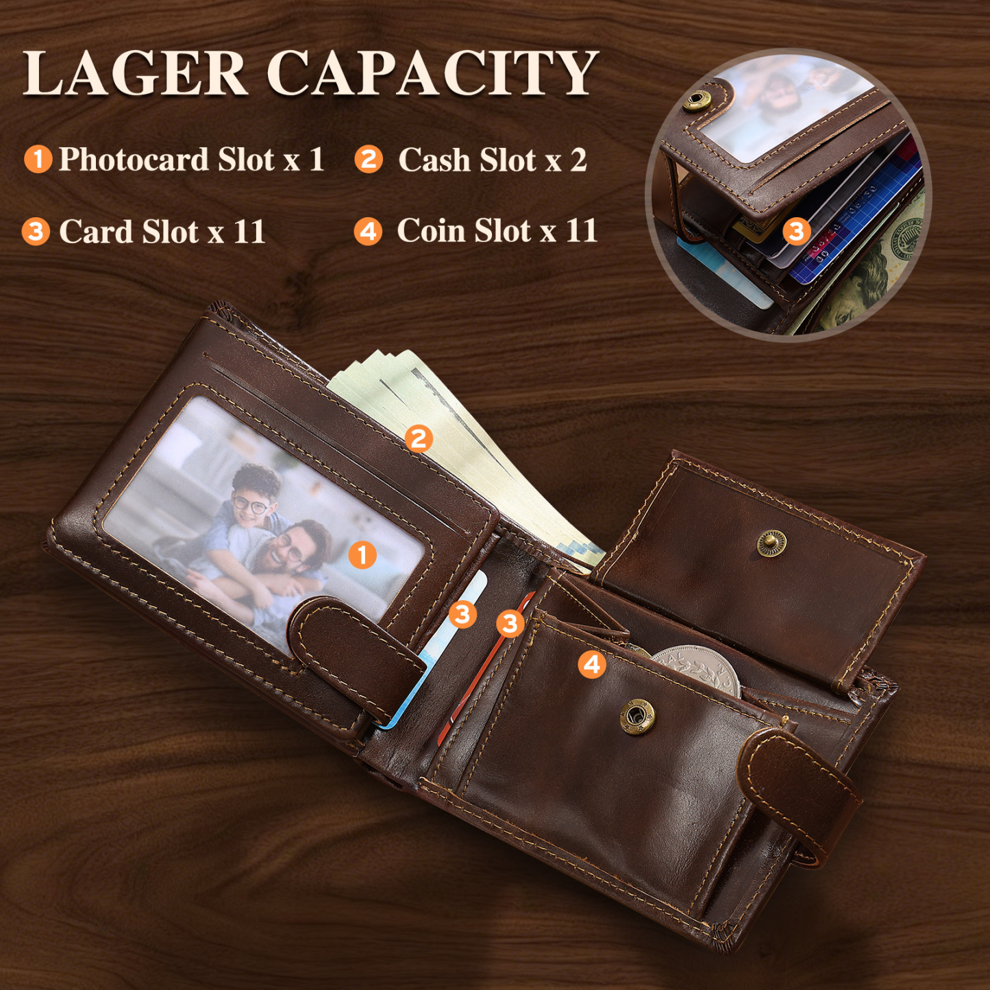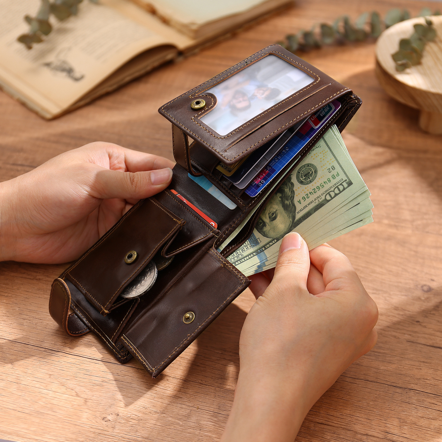 - Thoughtful layout: 11 card slots, 2 bill compartments, 1 photo/ID window, 1 coin pocket