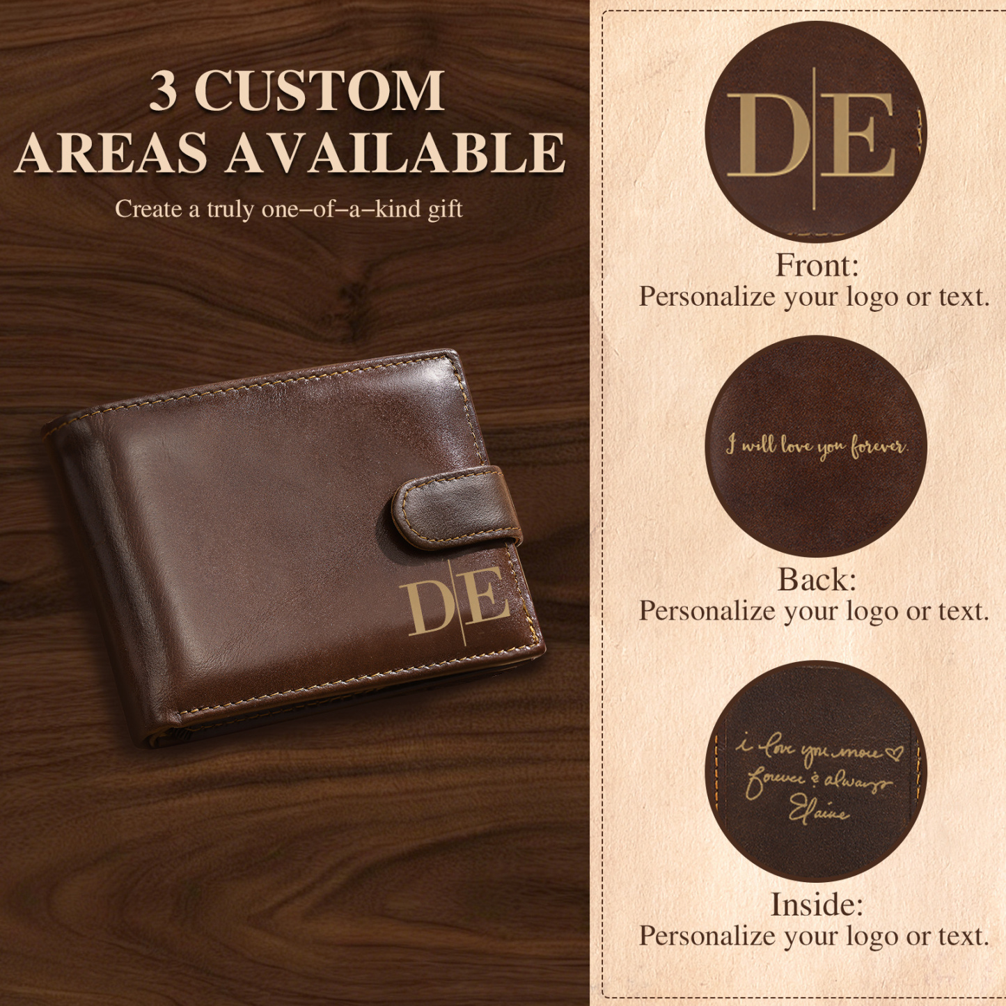 - Personalized engraving on 3 areas (front/back/inside): initials, name, logo, or custom text