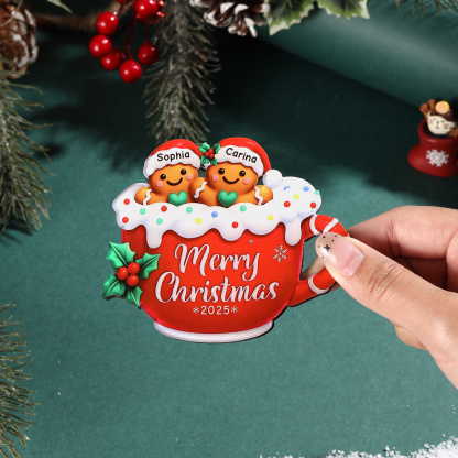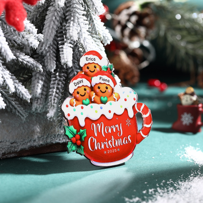 Give a heartfelt and useful gift with this personalized Christmas mug magnet, designed for families, couples, friends, and teachers. Add 1–9 names plus your own greeting and year—the cute gingerbread characters turn any fridge into a festive keepsake filled with love.