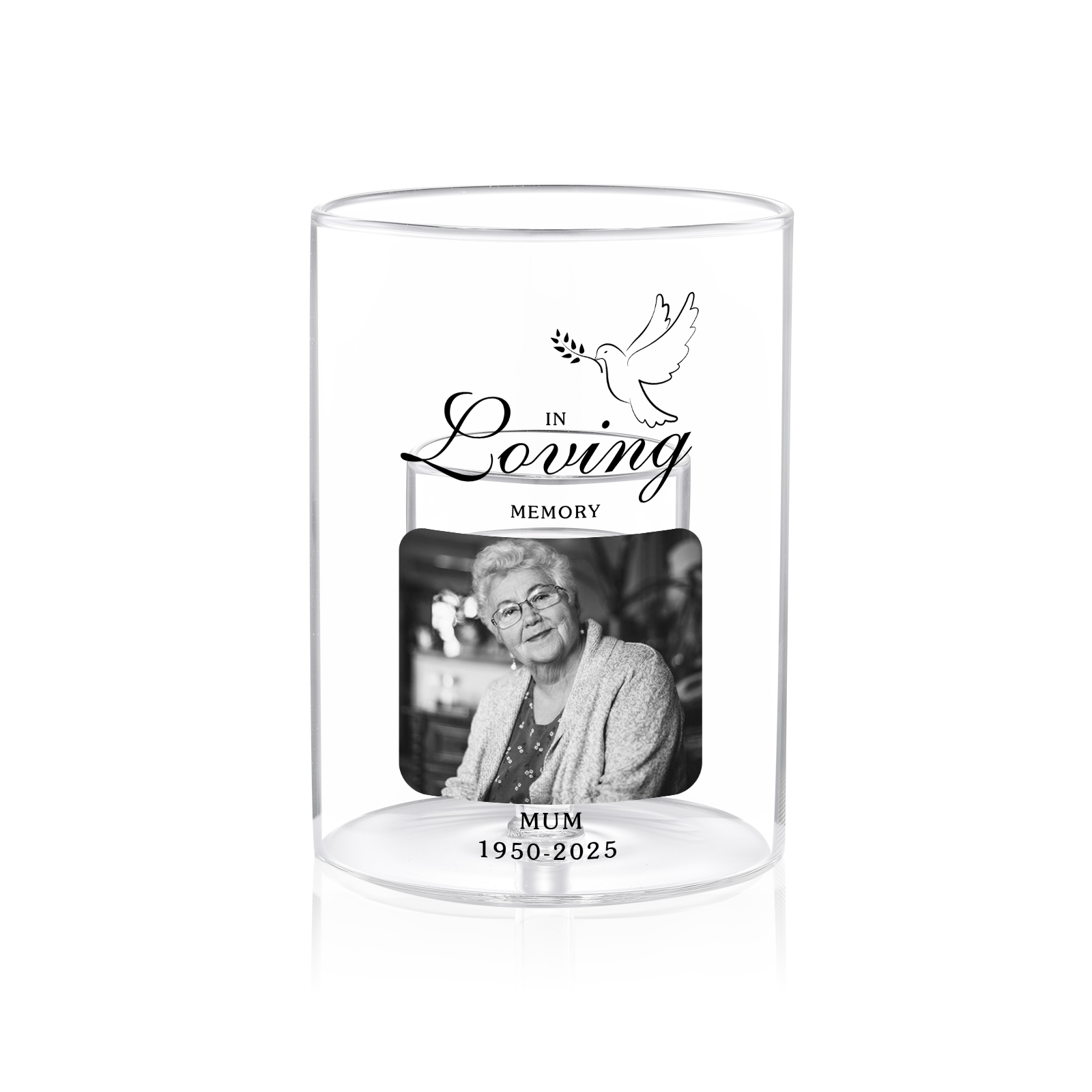 - Clear glass tealight holder with “In Loving Memory” and a dove motif