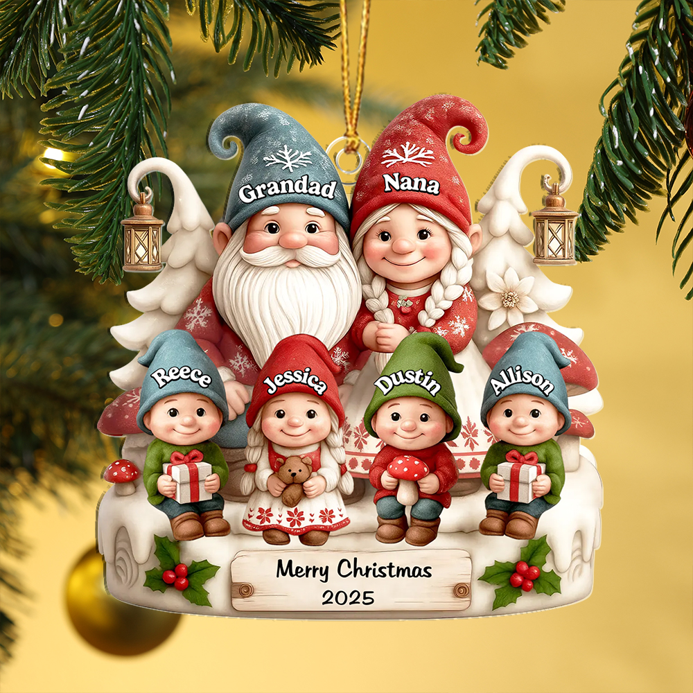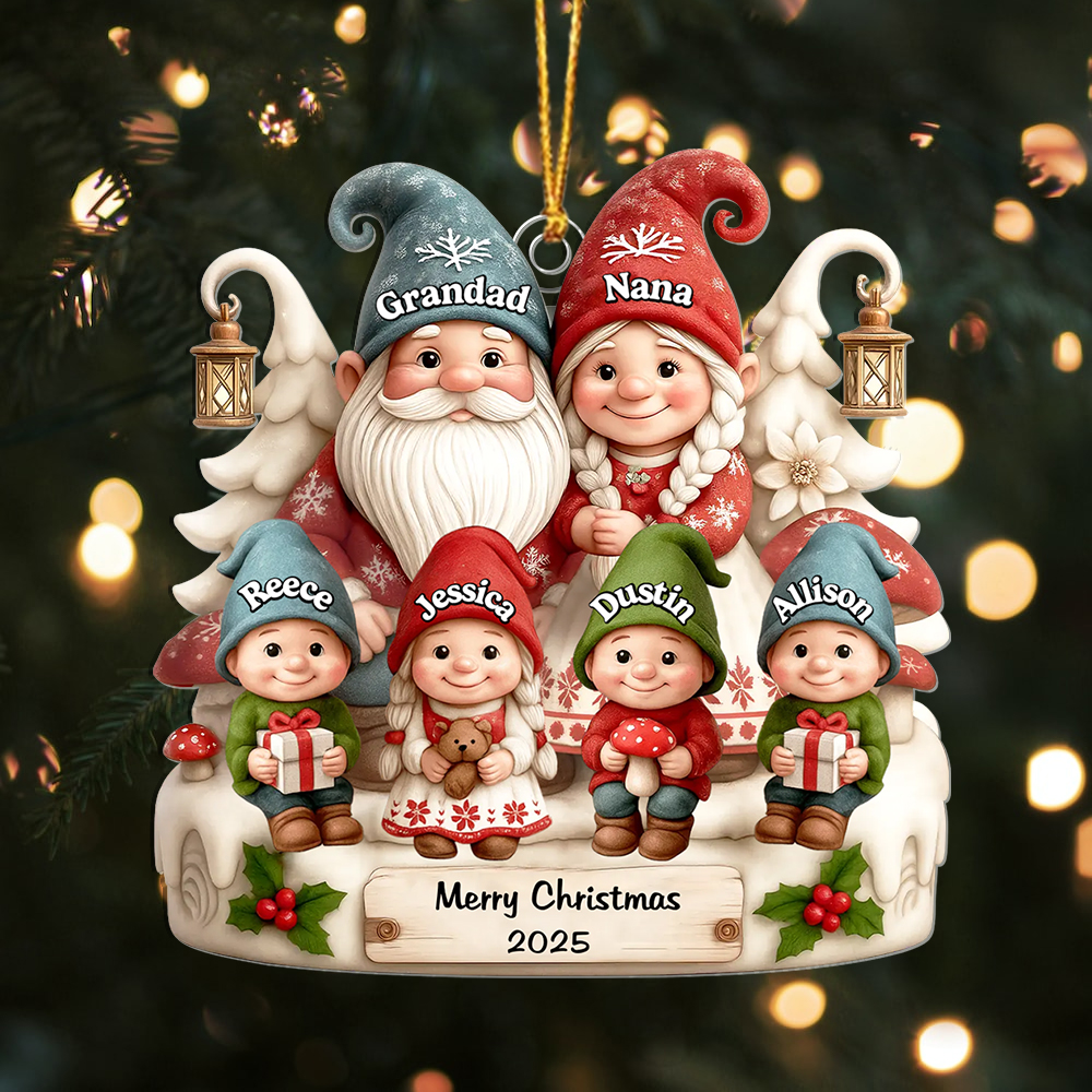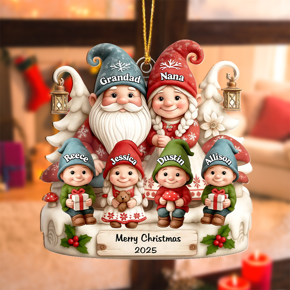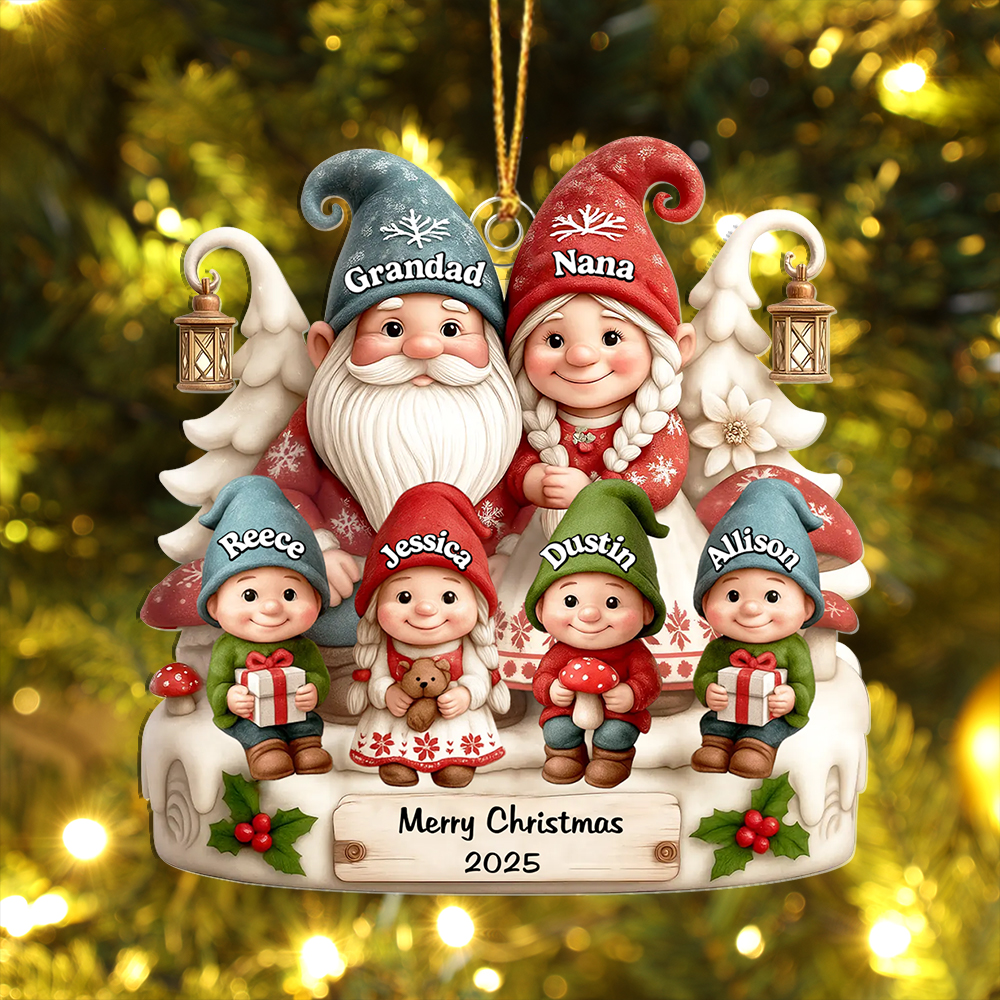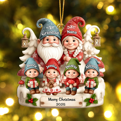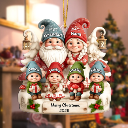Keywords: personalized Christmas ornament, family name ornament, custom Grandad Nana gift, gnome tree decoration, 2025 Christmas keepsake, personalised Xmas gift UK, stocking filler, sentimental holiday décor