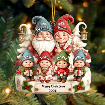 Give a heartfelt and useful gift with this personalized family gnome Christmas ornament, designed for Grandad, Nana, parents, or anyone special. Add names to the hats and the year on the plaque to create a keepsake that brings smiles to the tree year after year.