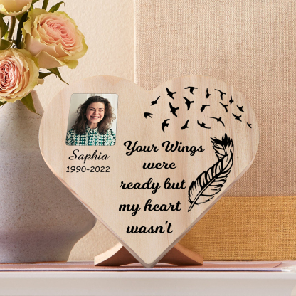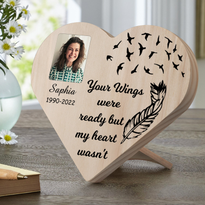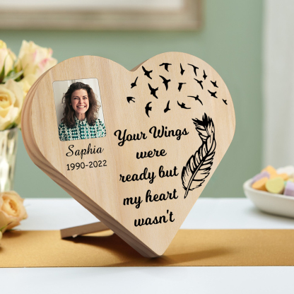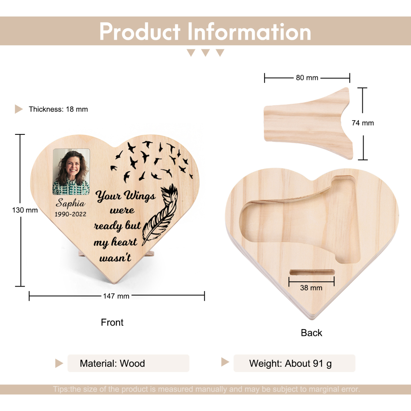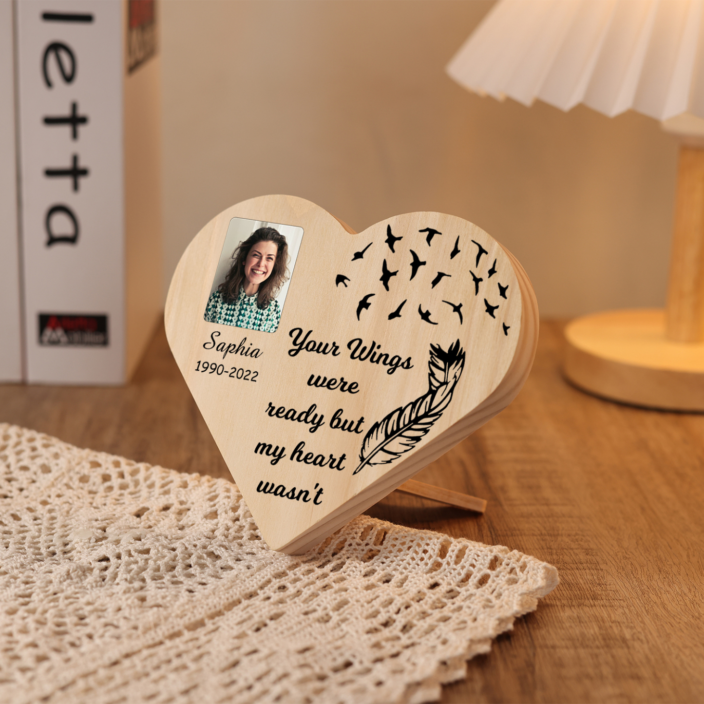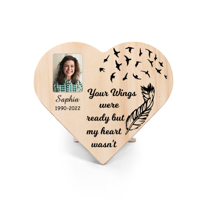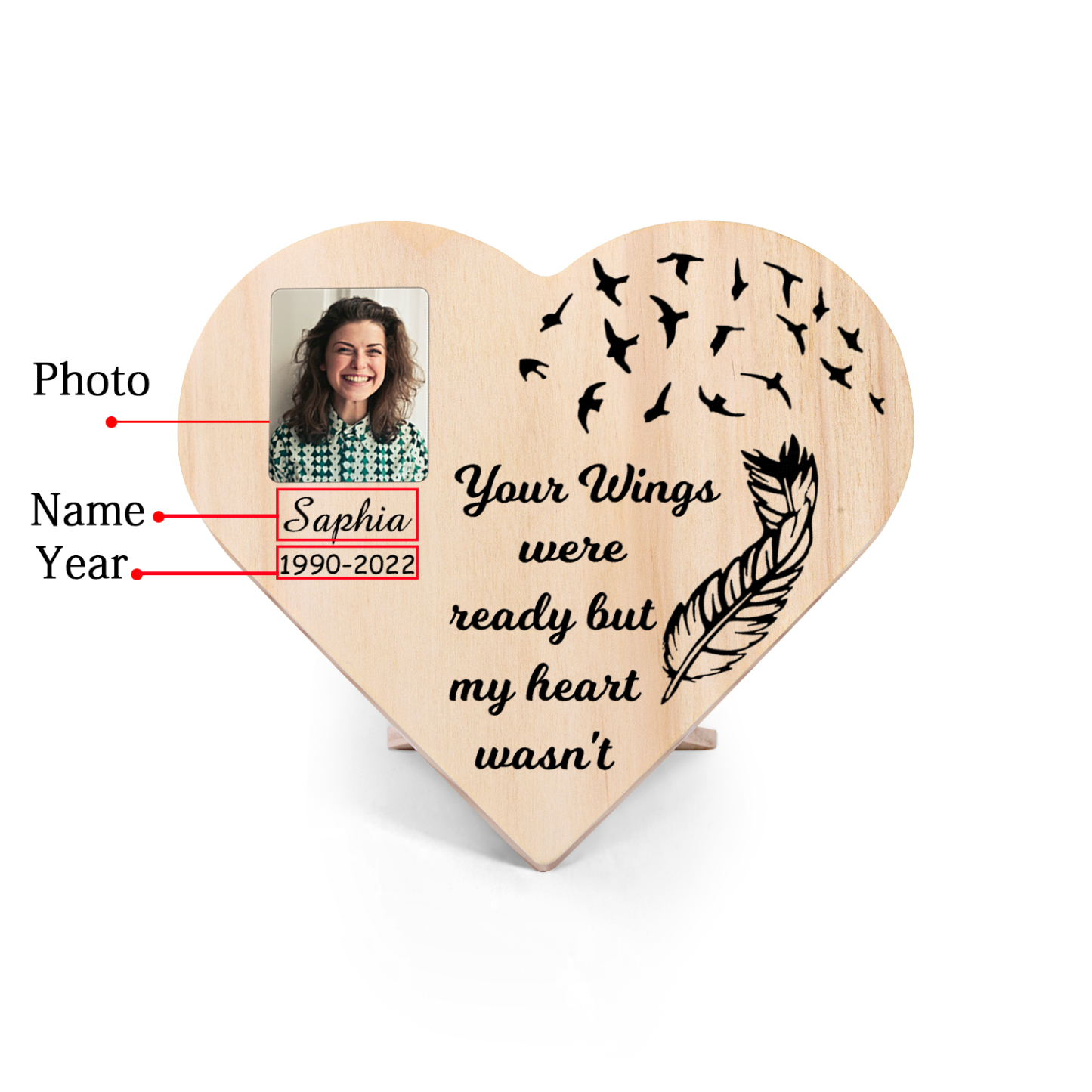 This custom piece is skillfully crafted in high-quality wood, featuring a delicate feather motif that symbolizes their enduring presence in your heart. You can personalize this keepsake with a name, photo, and date to create a unique tribute that will stand the test of time.