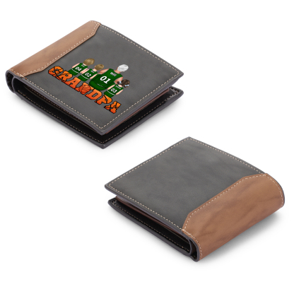 - Two‑tone gray and tan bifold wallet with custom “Grandpa + family team” artwork