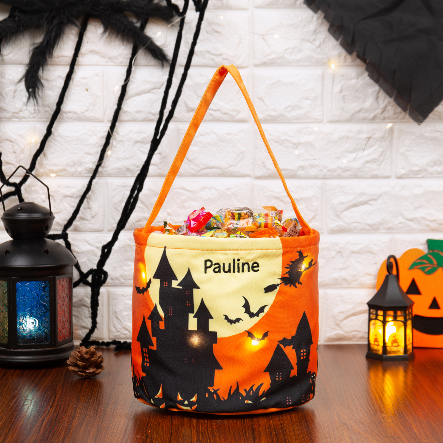 Personalized Happy Halloween Luminous Tote Bag Engraved 1 Name, Custom Name LED Light Tote Bag Candy Gift Bag