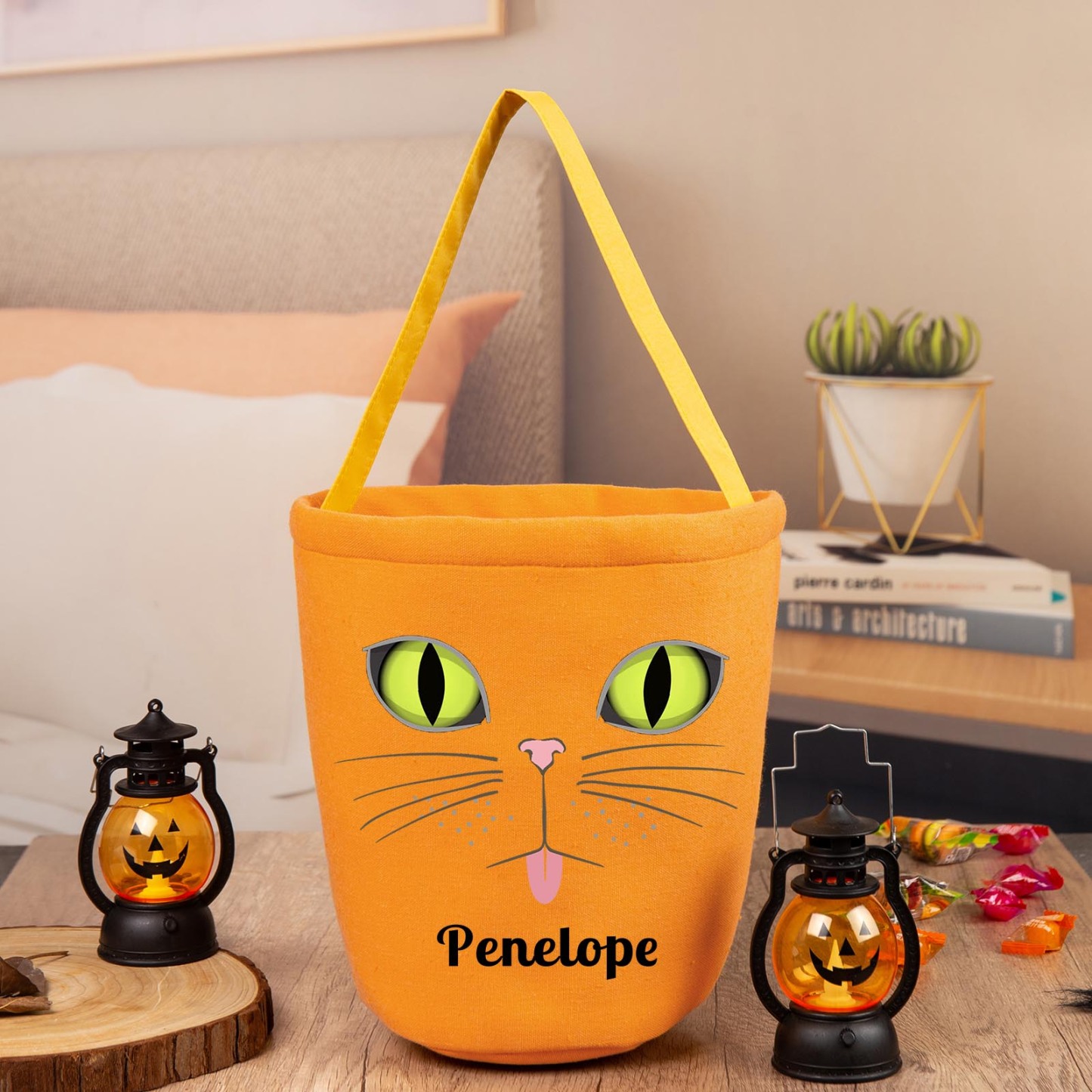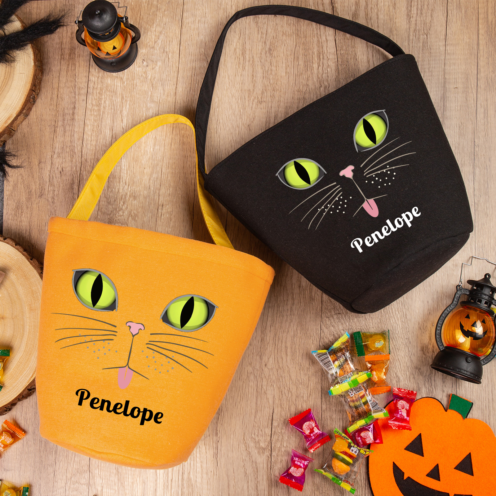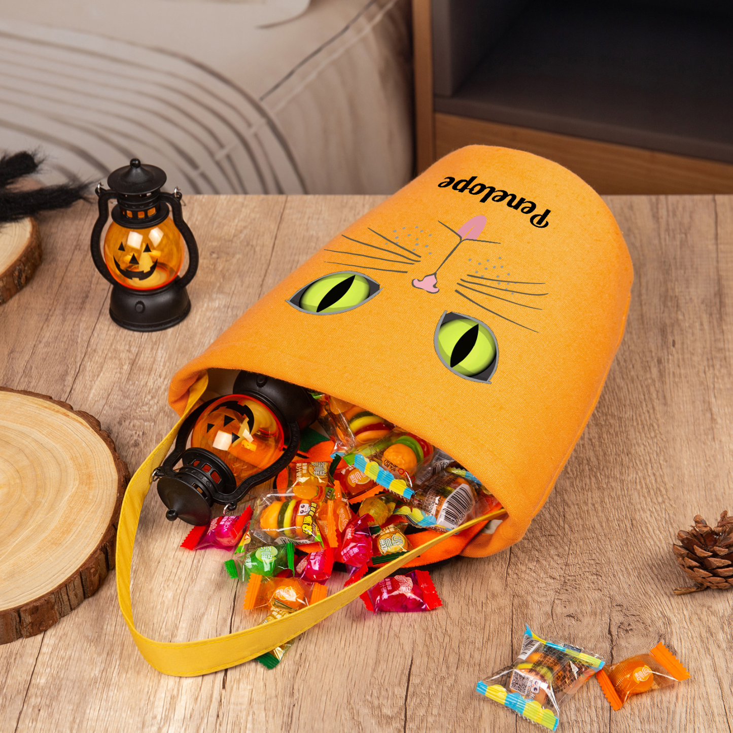 Personalized Happy Halloween Orange Cat Tote Bag, Custom 1 Name Candy Bag Halloween Gift Halloween Party