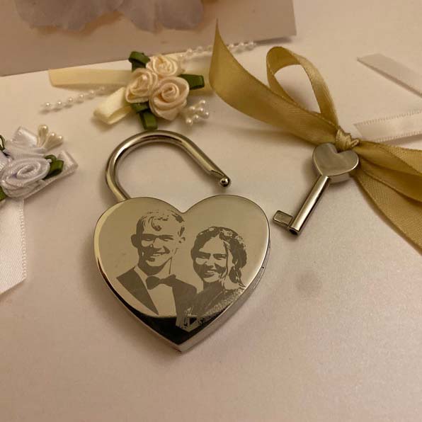 Our locks are engraved by a laser engraver to creat permanent, clean, and beautiful inscriptions. A high intensity laser removes the anodized color of the lock, leaving behind the bright exposed aluminum.